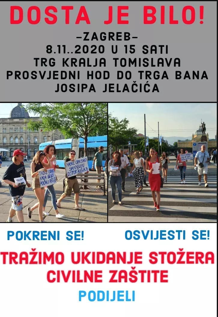 Danas u 15 sati u Zagrebu se održava prosvjed protiv mjera Nacionalnog stožera. Na prosvjed se pozivalo putem Facebook grupe "Tražimo ukidanje Nacionalnog stožera civilne zaštite" koja ima 160.000 ljudi, a ostaje za vidjeti koliko će se od njih pojaviti na prosvjedu, javlja Index.