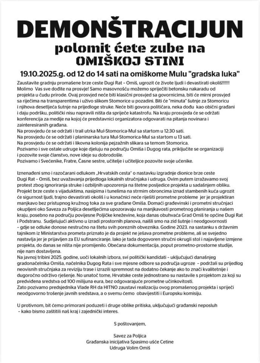 Prosvjednici najavljuju mirno okupljanje građana kojim žele izraziti protivljenje izgradnji brze ceste Dugi Rat–Omiš, tvrdeći da bi projekt u sadašnjem obliku ugrozio živote ljudi, devastirao okoliš i trajno narušio prirodni krajolik omiškog područja.