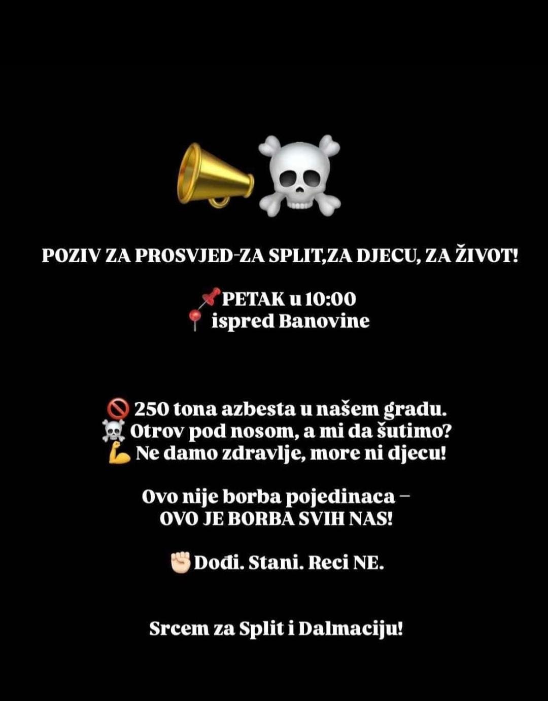 – Petak u 10 sati ispred Banovine. Otrov pod nosom, a mi da šutimo? Ne damo zdravlje, more ni djecu! Ovo nije borba pojedinaca – OVO JE BORBA SVIH NAS! Dođi. Stani. Reci NE. Srcem za Split i Dalmaciju!