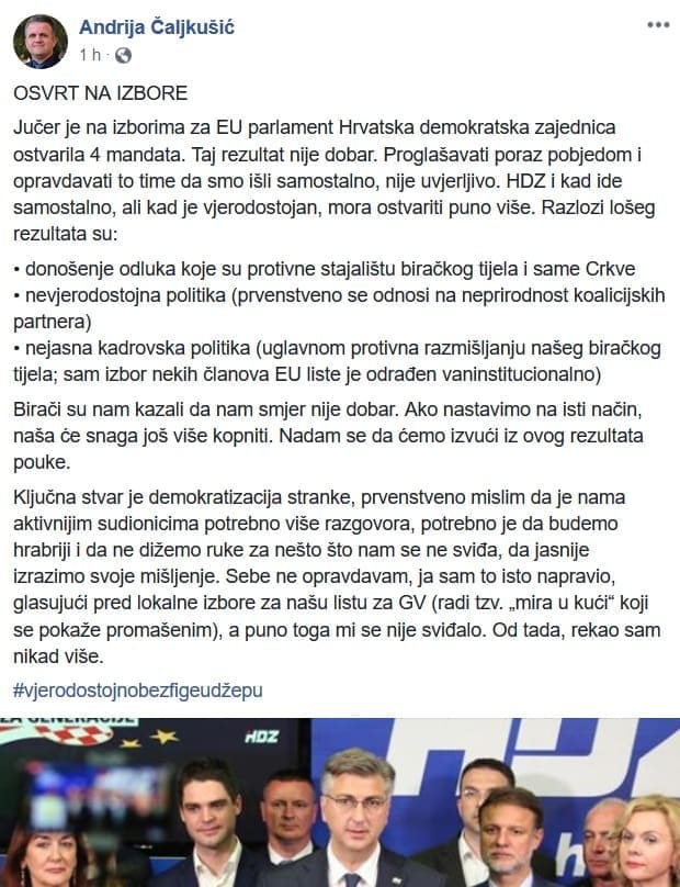 "Jučer je na izborima za EU parlament Hrvatska demokratska zajednica ostvarila 4 mandata. Taj rezultat nije dobar. Proglašavati poraz pobjedom i opravdavati to time da smo išli samostalno, nije uvjerljivo. HDZ i kad ide samostalno, ali kad je vjerodostojan, mora ostvariti puno više. Razlozi lošeg rezultata su: