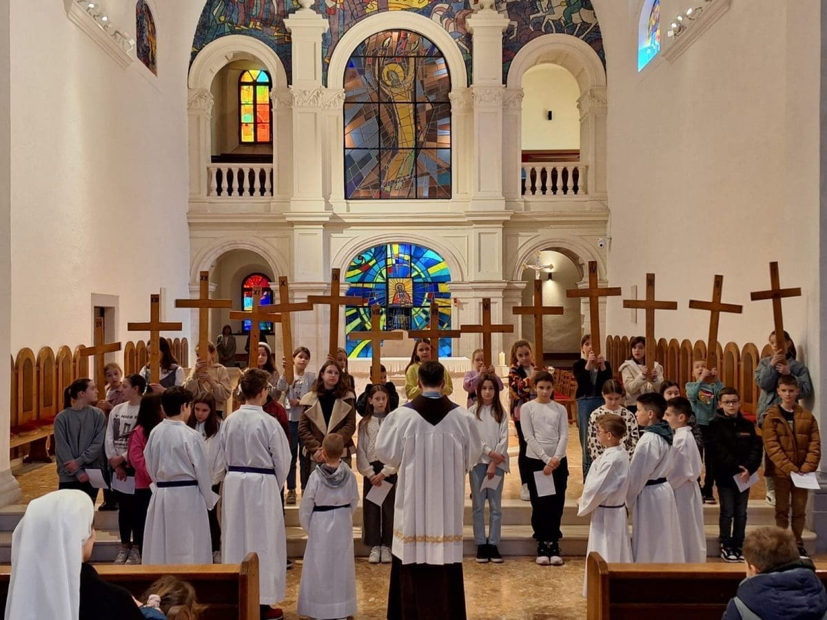 U 13 sati (petak, 16.2) djeca su sudjelovala i animirala pobožnost Križnog puta u crkvi Čudotvorne Gospe Sinjske.