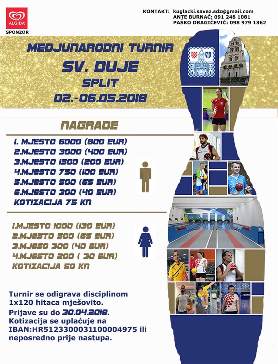 Kuglački savez Splitsko-dalmatinske županije pridružio se brojnim događanjima ususret obilježavanju dana Svetog Dujma, nebeskog zaštitnika Grada Splita, te po prvi puta organizira pojedinačni međunarodni turnir u kuglanju. Ovaj izuzetno psihofizički naporni sport u 2017. godini bio je najtrofejniji ekipni sport u Gradu Splitu, zahvaljujući uspjesima splitskih klubova Mertojaku (prvak i pobjednik kupa i 4. na Svjetskom kupu) , Poštaru (treći u prvenstvu i kupu) i ženskom kuglačkom kluba Splitu (treći u kupu).