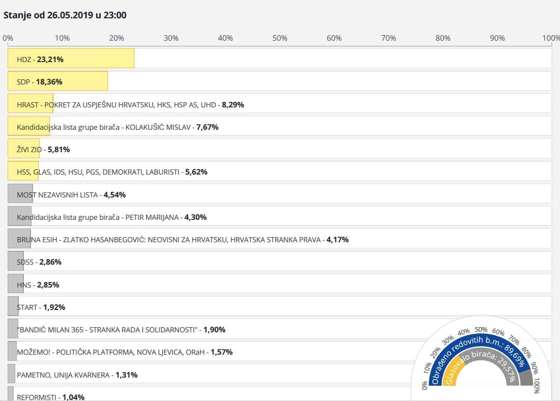 Lista HDZ-a osvojila je 23,21% glasova i osvaja 5 mandata. SDP je osvojio 18,36% i osvaja 3 mandata. Suverenisti su osvojili 8,29 posto i osvajaju 1 mandat. Slijedi NL Kolakušić 7,67 posto i 1 mandat. Živi zid osvojio je 5,81 % i 1 mandat i Amsterdamska koalicija 5,62% i 1 mandat.