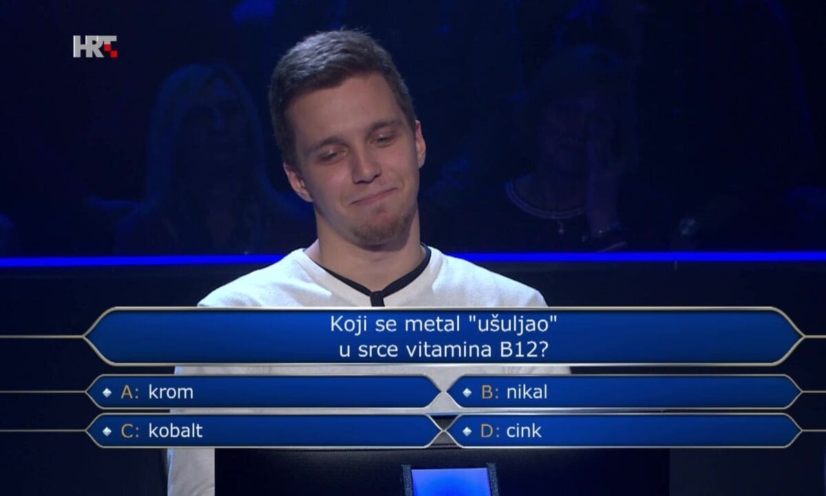 I voditelj Tarik Filipović bio je vrlo uzbuđen zbog mogućnosti da Pavao nastavi uspješan niz, jer samo su ga tri pitanja dijelila od milijuna, a još je dva džokera imao u "džepu". Nažalost, "pao" je odmah na prvom! Pitanje za 250.000 kuna glasilo je: Koji se metal "ušuljao" u srce vitamina B12 - krom, nikal, kobalt ili cink? Nije išao na džoker pola-pola, već je zatražio pomoć publike, koja je s čak 62 posto stisnula odgovor cink. Poslušao je savjet, ali odgovor je bio pogrešan! Radilo se o kobaltu - jedinom metalu u strukturi nekog vitamina, B12 ili kobalamina, javlja HTV.