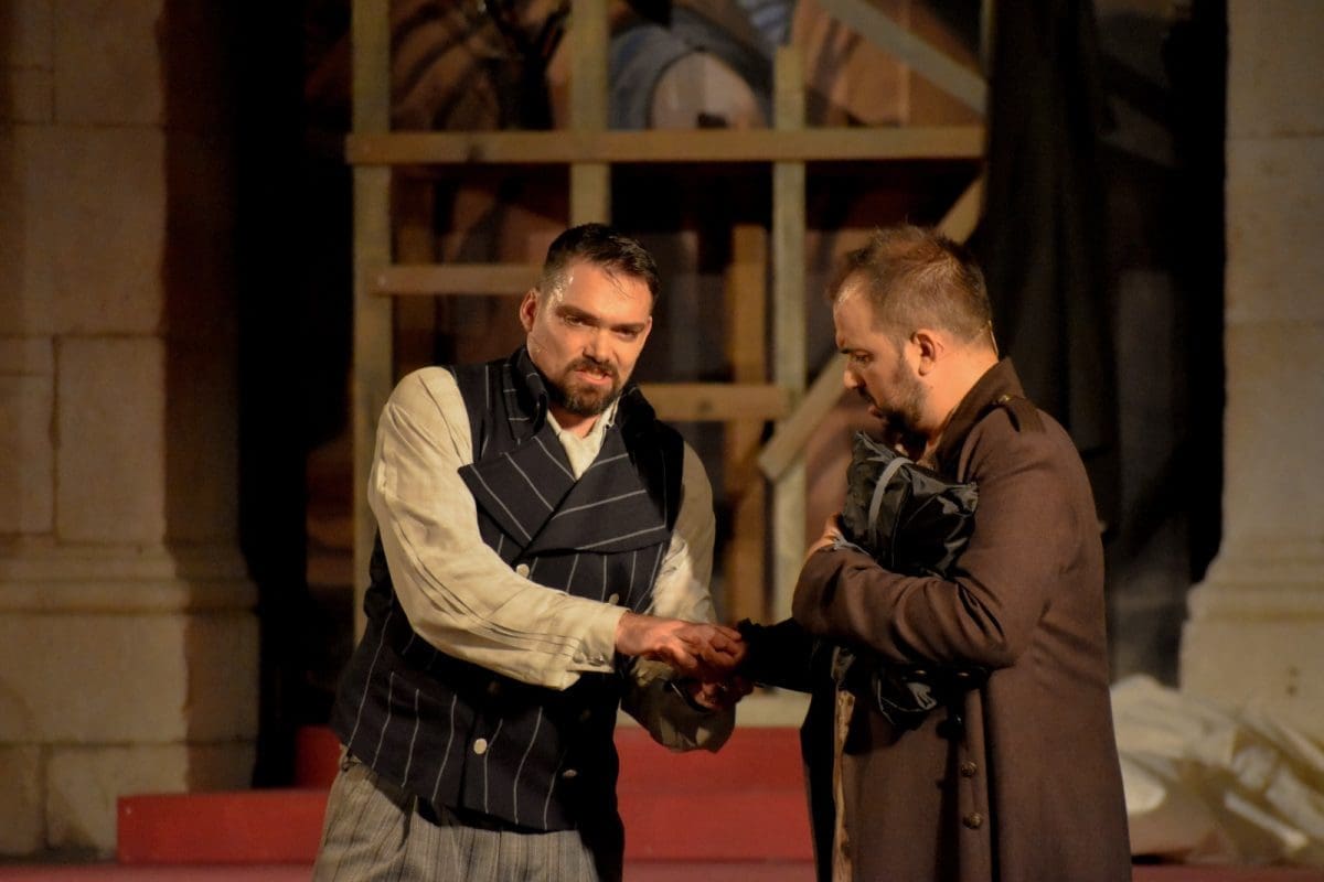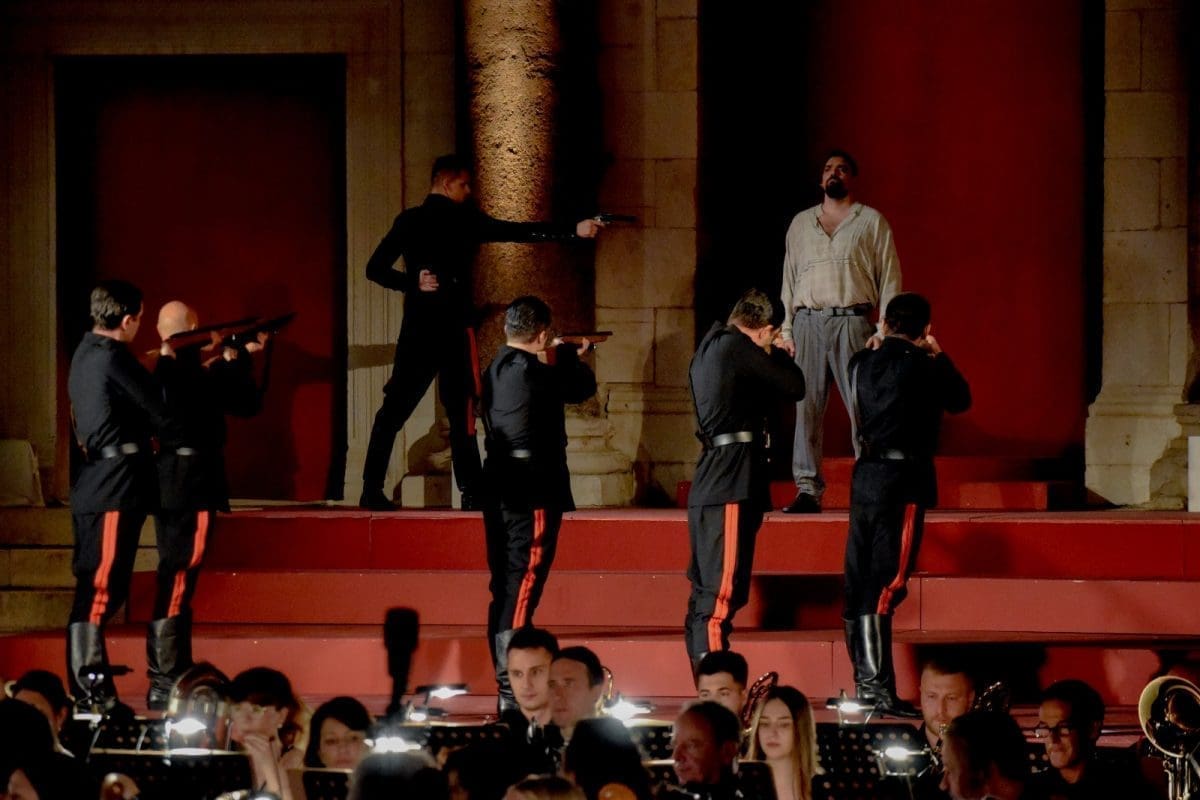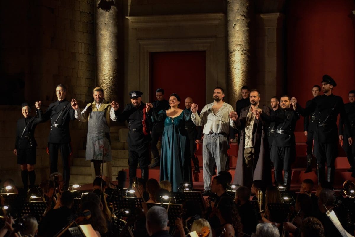 Uz malen odmak od najavne medijske konferencije, pošteno je primijetiti koliko je korisno što su se solisti (napose Batinić) i maestro Ivo Lipanović osvrnuli na važnost iskrene komunikacije oko pitanja nad kojima su se lomila koplja. Gustoća partiture s početnim teškim akordima pa zatim arioznim recitativima, intimnim duetima – sve do žustre igre mačke i miša kod Scarpije i Tosce zahtijevala je od orkestra i njihova maestra nevjerojatnu koncentraciju u doziranju žustrine i dinamike da solisti u nadjačavanju ne ugroze svoje glasove. Budući da su se pjevači, osim u rijetkim trenucima rubnih (i akustički nepovoljnih) lokacija na Peristilu i pri usponu na pozornicu, sjajno čuli i nadopunjavali s orkestrom, jasno je da se na ujednačavanju glasova i instrumenata ozbiljno radilo, što je slučaj i sa Zborom. Na kraju krajeva, na Peristilu se ne može ni utjecati na mnoge faktore (vjetar, zvukove iz ugostiteljskih objekata, prolaske turista i još štošta), no na problematiku ovoga prostora i akustike još ćemo se vratiti.
