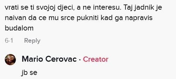 "Vrati se ti svojoj djeci, a ne interesu. Taj jadnik je naivan da će mu srce puknuti kad ga napraviš budalom", pisalo je, a Marijan je na to grubo odgovorio, prenosi Index.
