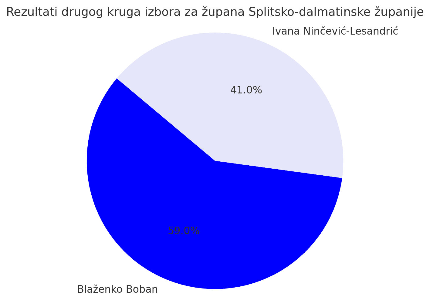 Nakon 100 posto prebrojenih glasova, HDZ-ov Blaženko Boban ostaje splitsko-dalmatinski župan. Osvojio je 73.638 glasova (59 posto), naspram 51.246 (41 posto) koliko je osvojila nezavisna Ivana Ninčević-Lesandrić.