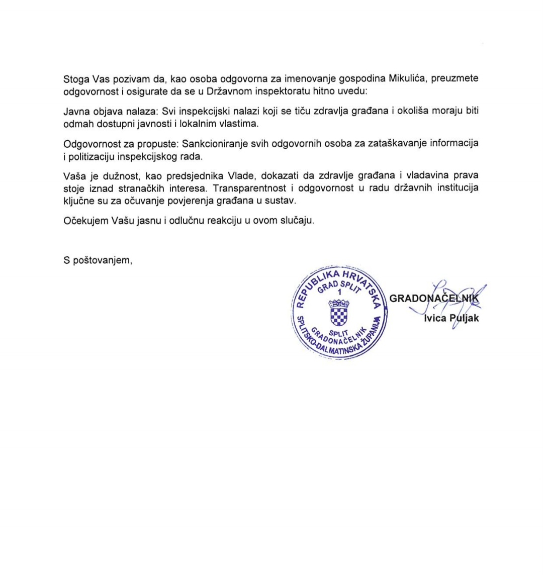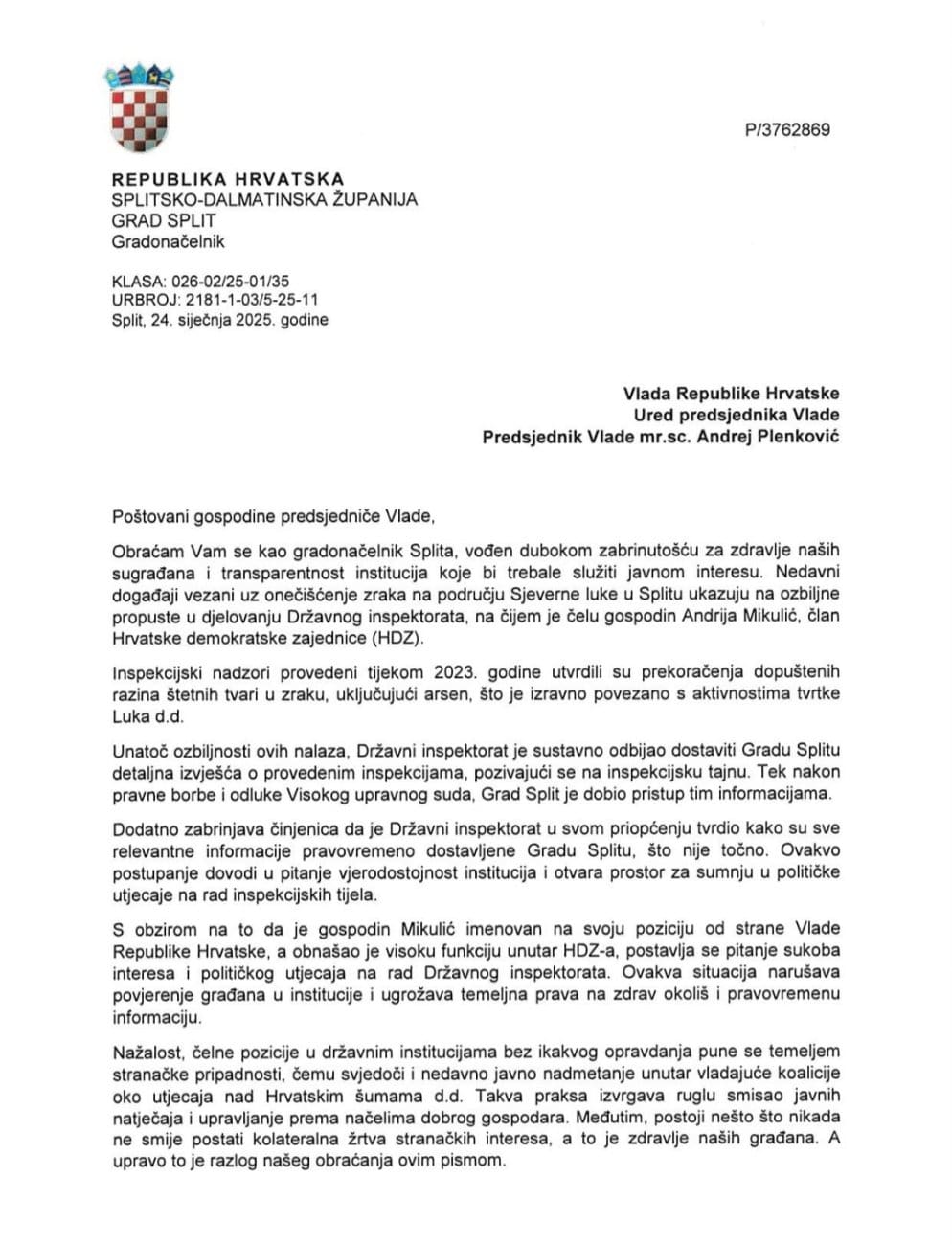 Gradonačelnik Splita Ivica Puljak danas je uputio pismo predsjedniku Vlade RH Andreju Plenkoviću zbog zabrinjavajućeg onečišćenja zraka u području Sjeverne luke te ozbiljnih propusta u radu Državnog inspektorata RH.