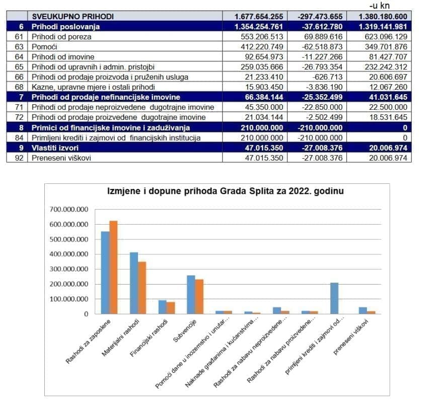Splitski gradski vijećnici u četvrtak će raspravljati o Prijedlogu izmjena i dopuna Proračuna Grada Splita za 2022. godinu s projekcijama za 2023. i 2024. godinu po kojem će gradski proračun, ako se usvoji po prijedlogu gradonačelnika Ivice Puljka, za ovu godinu biti manji za gotovo 300 milijuna kuna od onog usvojenog u prosincu 2021. godine. Reteriralo se sa 1,677 milijardi na 1,380 milijardi kuna.