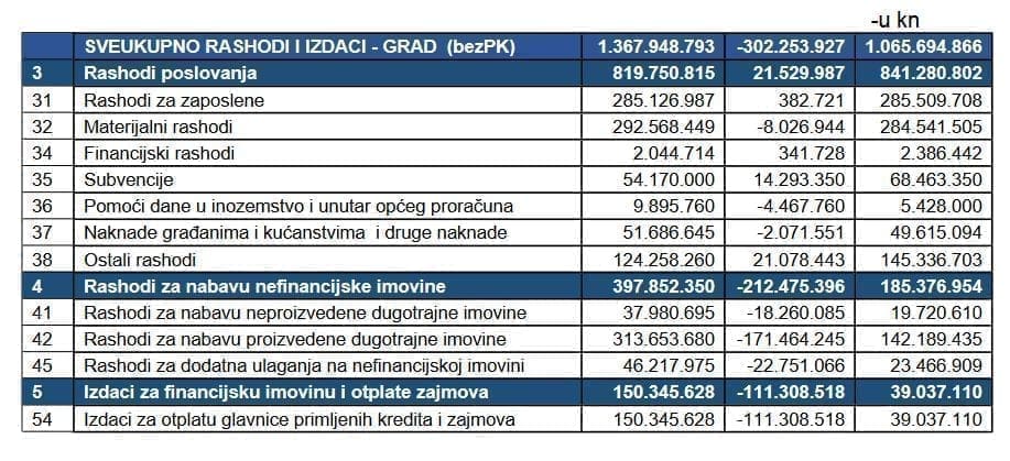Novca će za investicije biti ukupno manje za 218,8 milijuna kuna, a plaće i vezani rashodi su uglavnom bez promjene i iznose 285 milijuna kuna u što nisu ubrojena namjenska sredstva proračunskih korisnika od 314,5 milijuna kuna. Odsjek za socijalnu skrb i zdravstvenu zaštitu će po planu imati 12,8 milijuna kuna manje, a Odsjek za demografsku potporu i međugeneracijsku solidarnost 12 milijuna kuna manje. Zanimljivo je i da će do kraja godine za Odsjek za sigurnost i upravljanje kriznim situacijama bit izdvojeno 16,5 milijuna kuna manje nego što je to bilo planirano u prosincu prošle godine.