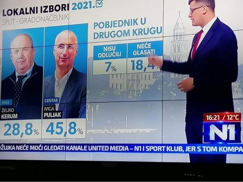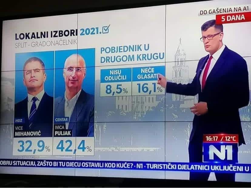 Kako je N1 objavio, prednost u utrci za drugi krug imaju Vice Mihanović (HDZ) sa 17,5% i Željko Kerum (HGS) sa 16,6%. U malom su zaostatku Ivica Puljak (13%) i Branka Ramljak (12%). Zaostaju SDP-ov Ante Franić (9,2%), MOST-ov Ivica Grković (8,6%) i kandidat Pametno za Split i Dalmaciju, Možemo i Nova ljevice Jakov Prkić (7,4%). Sličan je raspored i među neodlučnim glasačima kojih je 8,2%, javlja N1.