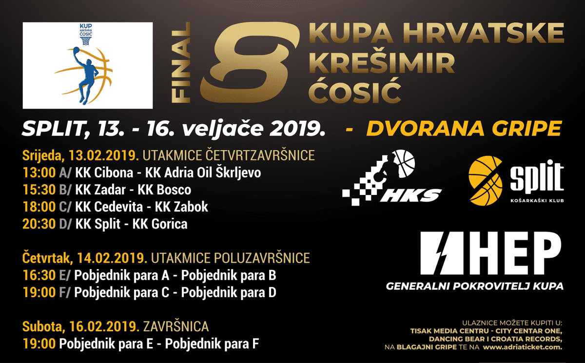 Ulaznice za završnicu Kupa Hrvatske "Krešimir Ćosić", koji će se održati u Splitu, u dvorani KK Split na Gripama, od 13. do 16. veljače, su upravo puštene u prodaju.