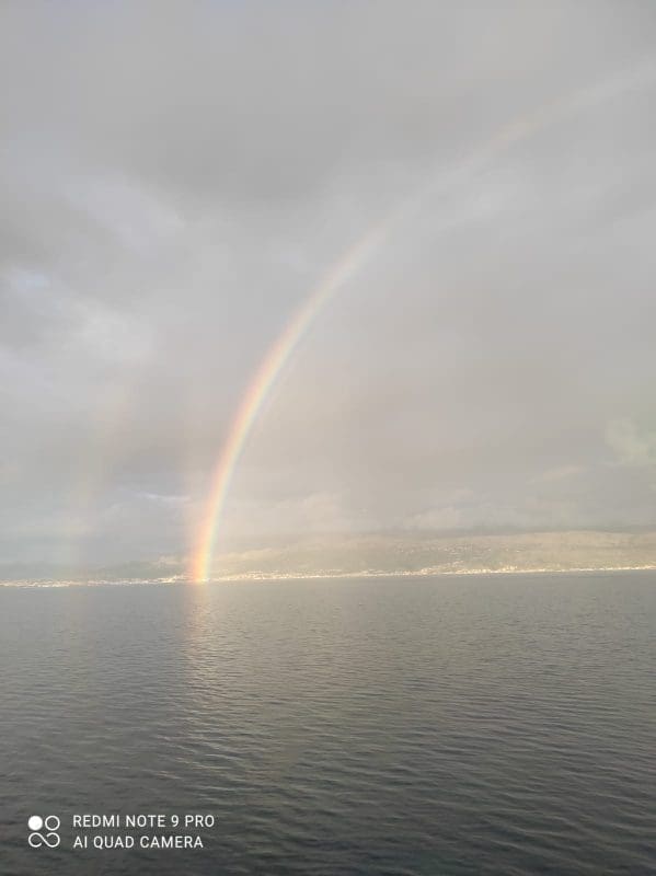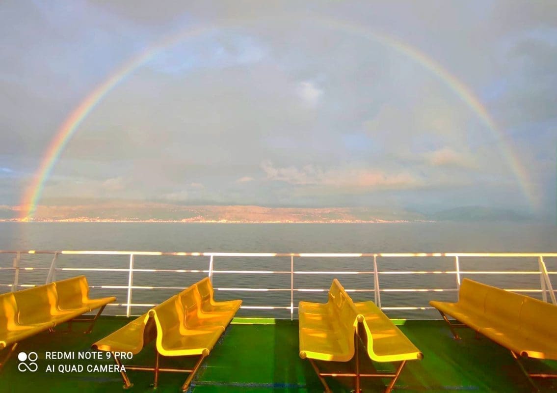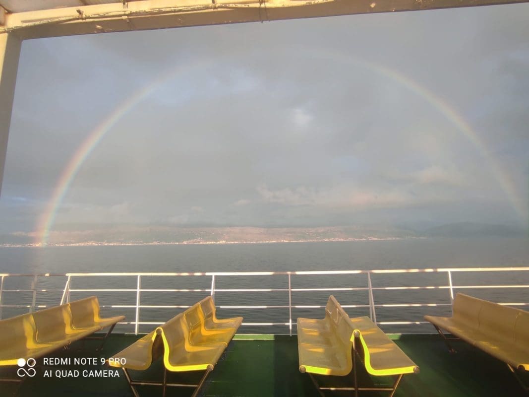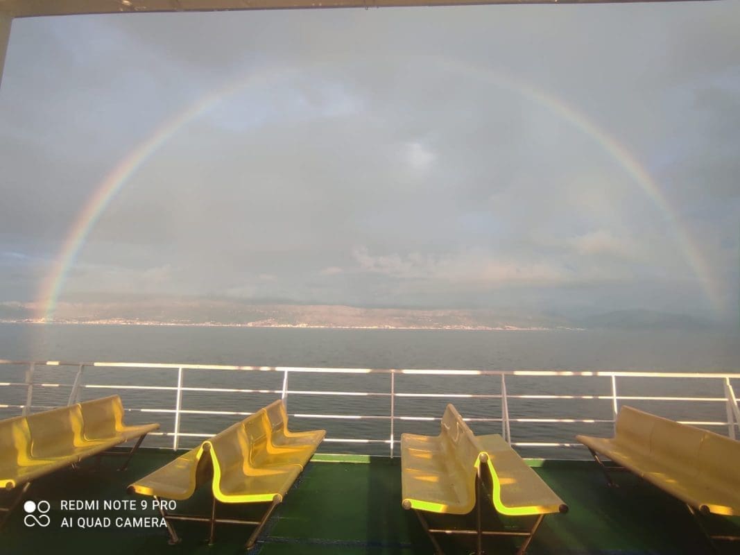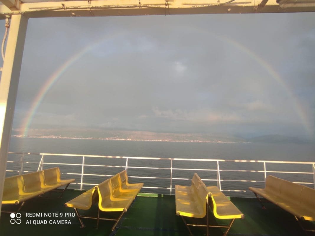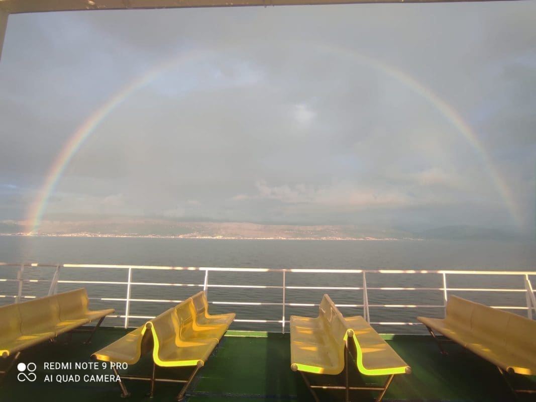 Pred kraj dana kišni oblaci stigli su do Bračkog kanala, a putnici Jadrolinijinog trajekta mogli su vidjeti prekrasnu dugu u pravcu Podstrane.