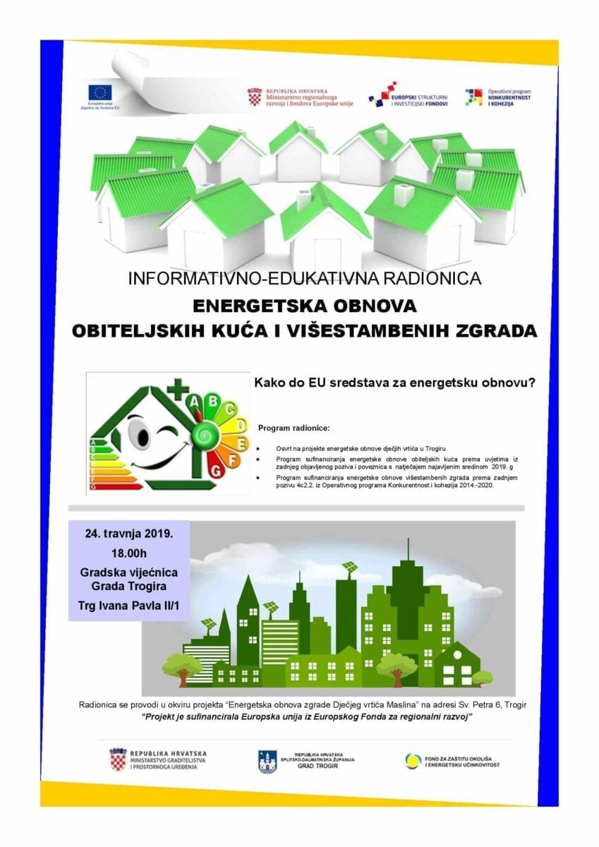 Sve o mogućnostima i uvjetima sufinanciranja energetske obnove obiteljskih kuća i višestambenih zgrada Trogirani će moći doznati u srijedu, 24. travnja u 18 sati. U Gradskoj vijećnici bit će održana informativno-edukativna radionica: „Kako do EU sredstava za energetsku obnovu?“.