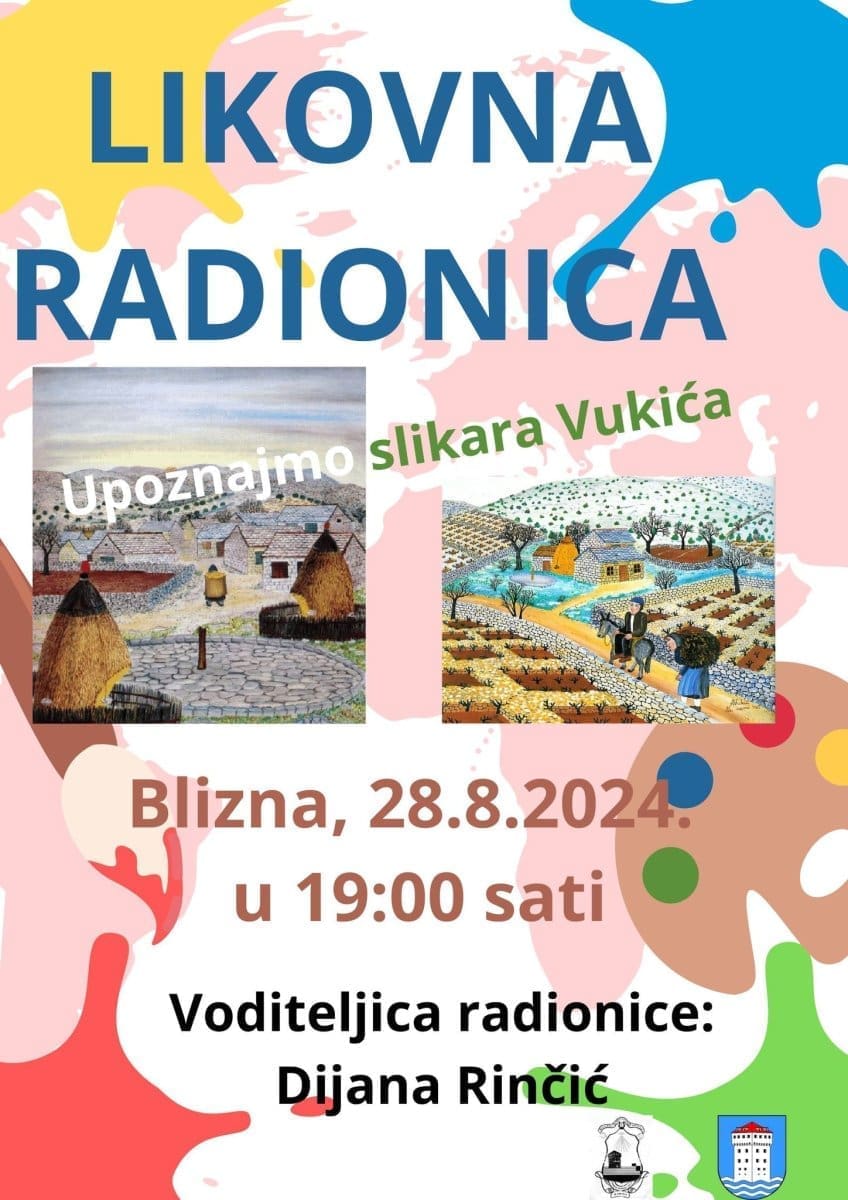 Likovna radionica "Upoznajmo slikara Vukića" započinje u 19:00 sati. Djeca će imati priliku upoznati rad slikara Ante Vukića, koji je rođen u Blizni Gornjoj, i sudjelovati u slikarskoj radionici inspiriranoj njegovim stilom.