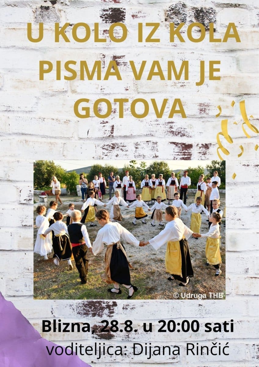Folklorna radionica "U kolo iz kola, pisma vam je gotova" počinje u 20:00 sati. Mališani će naučiti igrati tradicionalno biračko kolo.