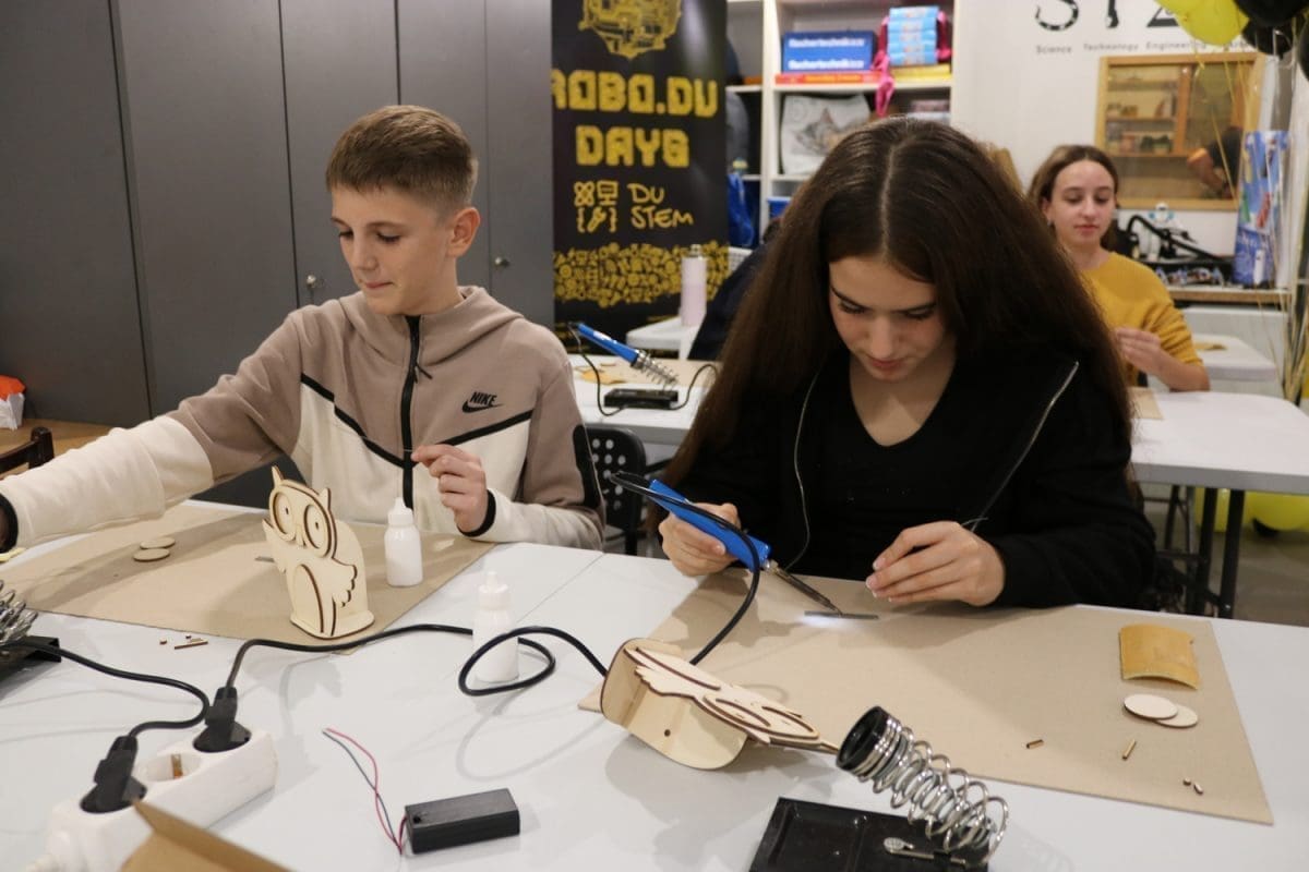 Sedmi Robo.Du Daysi započeli su jučer dvjema radionicama modelarstva i elektrotehnike, gdje su polaznici izrađivali sova svjetiljke. Tijelo sove izrađeno je od šperploče, a polaznici su dijelove sove spajali lijepljenjem, nakon čega su koristeći lemilicu na pločicu zalemili svjetleće diode koje su se ugradile u oči sove. Radionicu je vodio Zvonimir Lapov-Padovan iz Hrvatske zajednice tehničke kulture.