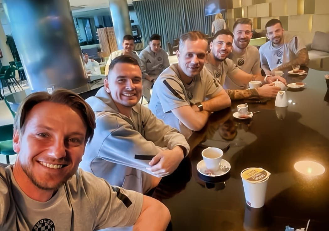 Na slici se vidi kako Rakitić i njegovi suigrači, u opuštenoj atmosferi, uz šalicu kave dijele trenutke druženja.