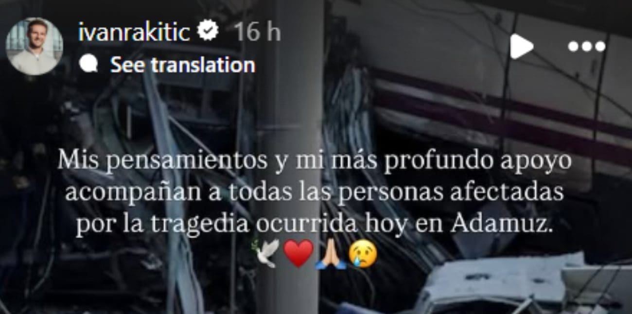 Rakitić je na Instagramu objavio poruku podrške i sućuti na španjolskom jeziku: "Moje misli i moja najdublja podrška uz sve osobe pogođene tragedijom koja se dogodila u Adamuzu." Uz objavu je dodao i emotikone golubice, srca, sklopljenih ruku i tužnog lica.