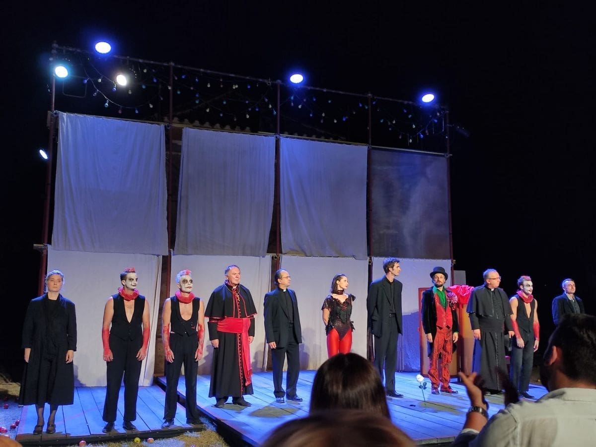 Glorija redatelja Dražena Ferenčine i dramaturginje Petre Mrduljaš na samome početku objašnjava nezgodan dualitet svoga lika, koji će se još jednom rascijepiti nakon otkrivanja vjere. Magična Katarina Romac na pozornicu izlazi s tri klauna (Alen Čelić, Maro Drobnić, Luka Čerjan) i ležerno se predstavlja kao Jagoda Kozlović. Međutim, čim je svuku u blještavi triko, ona robotizirano i vidno tužnije govori da se zove Glorija Fleche. Karakter je to koji je stvorio njezin otac, umjetnički nazvan Floki Fleche (Vicko Bilandžić), cirkuski direktor kojeg je rat također bacio na koljena. Otac nije jedina osoba koja pokušava modelirati Gloriju. Mladi don Jere (Mijo Jurišić), inteligentan, jezičav i osorno tvrdoglav svećenik odlučan je u naumu da od nedavno zaređene opatice stvori Gospin kip. Don Zane (karizmatični Trpimir Jurkić) donosi dobrodošlu notu humora i ironijskog odmaka, kao i biskup (Filip Radoš) koji nabacuje pošalice prikladnije pučaninu („Iz cirkusa – hopla – u samostan? Dobila je poziv? Na žici?“). Priključuje im se i don Florijo (Nenad Srdelić), groteskni proždrljivi svećenik koji „Boga zamišlja kao glavnog kuhara“. Tijekom cijele parade s kipom prelijepe i, za don Jerin ukus prežive Gospe, oko pozornice su rasute jabuke. Scenografski je to trenutak koji otvara mogućnost raznim interpretacijama, ali najuvjerljivijom se čini ona koja u malu župu ubacuje jabuku razdora, Adamovu i Evinu propast, koja izgleda toliko primamljivo – djevojku od koje se očekuje da bude Madona, astralno biće, hodajuća čistoća.