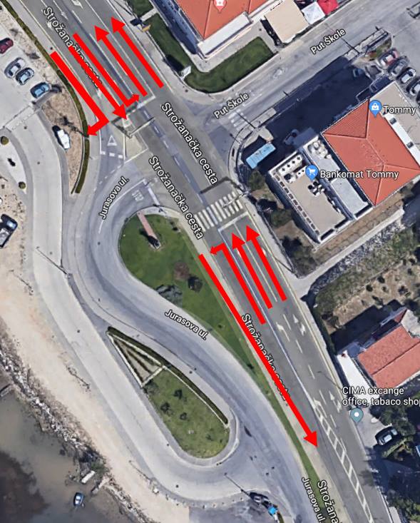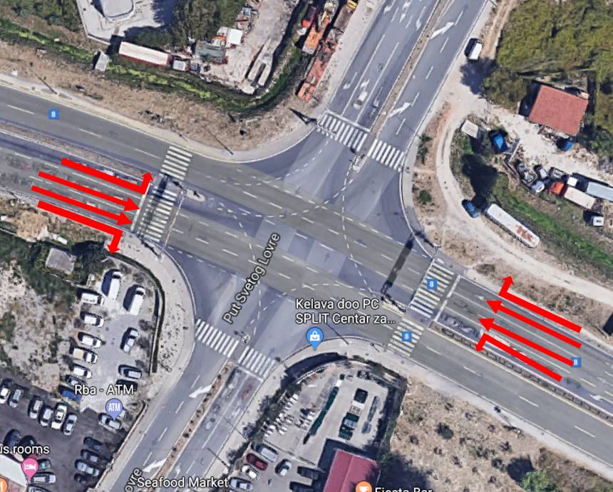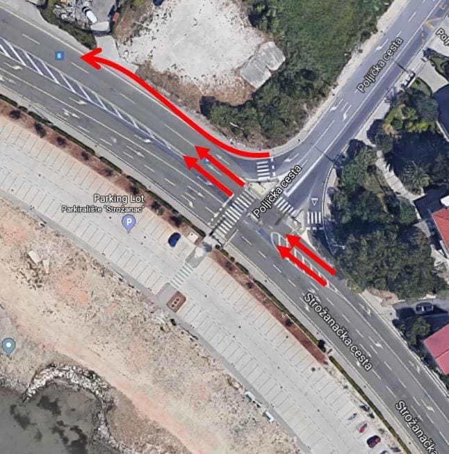 Na semaforu za skretanje prema Strožancu (kod Tommyja) dvije trake bi išle pravo, kao i iz smjera Splita te bi jedna iz smjera Splita bila odvojena još od prethodnog semafora za lučicu.