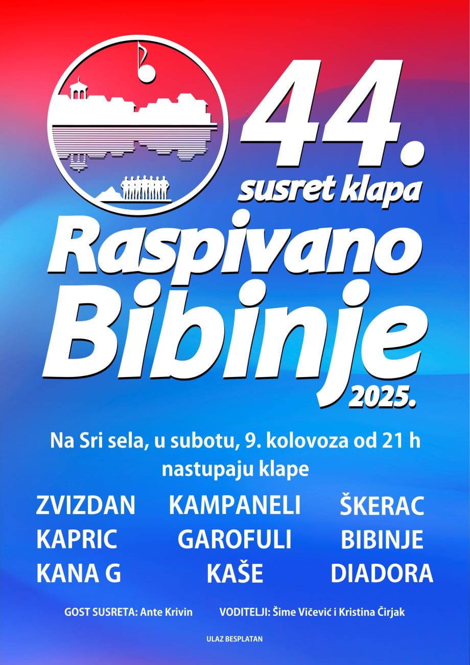 U subotu, 9. kolovoza 2025. s početkom u 21 sat na Trgu Sri sela u Bibinjama održat će se 44. izdanje Raspivanog Bibinja, najstarijeg susreta klapa u Zadarskoj županiji. Pokrenuta 1977. godine, ova manifestacijama desetljećima okuplja vrsne klape iz Hrvatske i susjedstva te promiče klapsku pjesmu kao dio kulturne baštine.