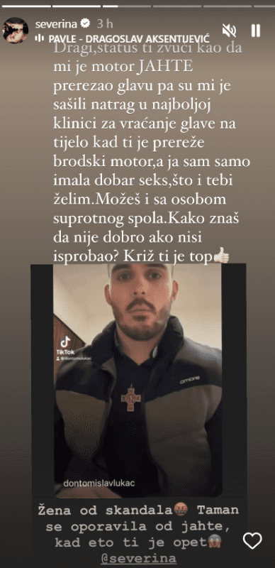Naime, podijelila je Instagram priču nepoznate osobe koja je podijelila video svećenika uz pogrdan komentar: 'Žena od skandala, taman se oporavila od jahte, kad evo je opet'.