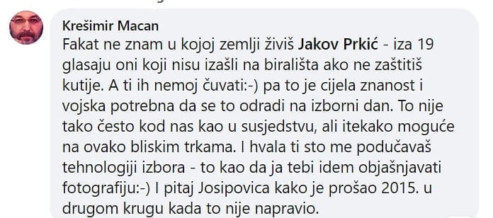 "Fakat ne znam u kojoj zemlji živiš Jakov Prkić - iza 19 glasaju oni koji nisu izašli na birališta ako ne zaštitiš kutije. A ti ih nemoj čuvati:-) pa to je cijela znanost i vojska potrebna da se to odradi na izborni dan. To nije tako često kod nas kao u susjedstvu, ali itekako moguće na ovako bliskim trkama. I hvala ti što me podučavaš tehnologiji izbora - to kao da ja tebi idem objašnjavati fotografiju. I pitaj Josipovića kako je prošao 2015. u drugom krugu kada to nije napravio", odgovorio je Macan Prkiću, pa mu je ovaj odgovorio: