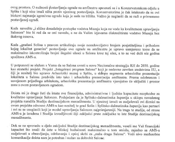 Ipak, mr. sc. Damir Kliškić, ravnatelj Arheološkog muzeja, odgovorio je dopisom na priopćenje solinskog gradonačelnika, koji prilažemo u prilogu: