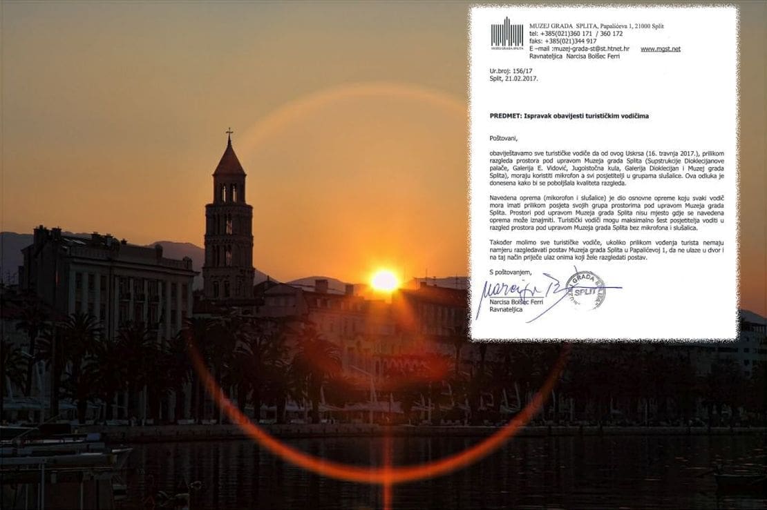 Turistički vodiči, blago rečeno, ostali su iznenađeni dopisom ravnateljice Muzeja grada Splita Narcise Bolšec Ferri u kojem je iznijela niz novih pravila prilikom posjeta prostora koji su pod upravom te institucije. Pravila bi se primjenjivala od Uskrsa, a od vodiča između ostalog traži da ne uvode turiste bez slušalica i mikrofona. Isti ovaj dopis je stigao na adrese vodiča još prošle godine, a od pravila se u međuvremenu odustalo. Sada su vodiči dobili poziv da se sutra sastanu s ravnateljicom zbog aktualiziranja ovih pravila te ostali šokirani intencijom da se ova pravila ponovno pokušaju uvesti.