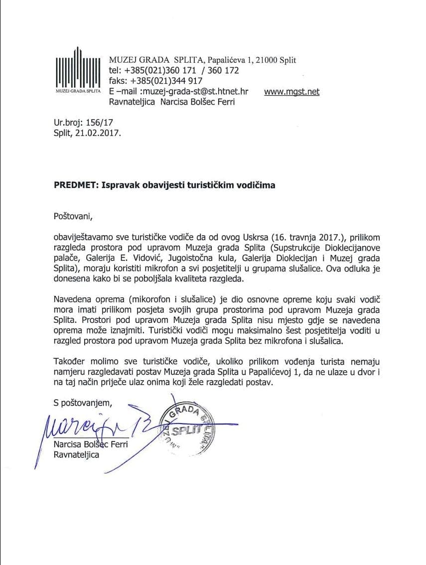 - Obavještavamo sve turističke vodiče da od ovog Uskrsa (16. travnja 2017.), prilikom razgleda prostora pod upravom Muzeja grada Splita (Supstrukcije Dioklecijanove palače, Galerija E. Vidović, Jugoistočna kula, Galerija Dioklecijan i Muzej grada Splita), moraju koristiti mikrofon a svi posjetitelji u grupama slušalice. Ova odluka je donesena kako bi se poboljšala kvaliteta razgleda. Navedena oprema (mikrofon i slušalice) je dio osnovne opreme koju svaki vodič mora imati prilikom posjeta svojih grupa prostorima pod upravom Muzeja grada Splita. Prostori pod upravom Muzeja grada Splita nisu mjesto gdje se navedena oprema može iznajmiti. Turistički vodiči mogu maksimalno dvoje posjetitelja voditi u razgled prostora pod upravom Muzeja grada Splita bez mikrofona i slušalica. Također molimo sve turističke vodiče, ukoliko prilikom vođenja turista nemaju namjeru razgledavati postav Muzeja grada Splita u Papalićevoj 1, da ne ulaze u dvor i na taj način priječe ulaz onima koji žele razgledati postav. - stoji u dopisu.