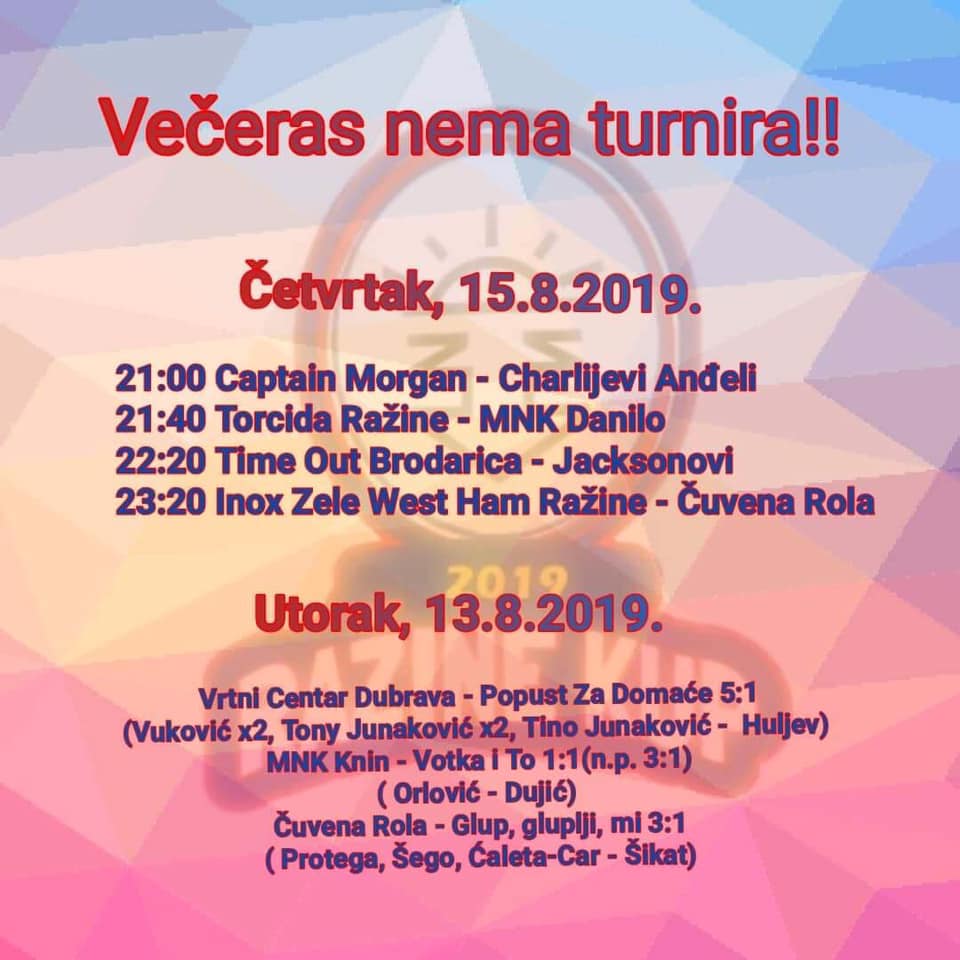 Posljednji susret večeri je ujedno i šlag na torti večeras, a u njemu se sastaju uigrana i iskusna ekipa Čuvene Role, te Inox Zele West Ham Ražine koji predvode malonogometaši Perić, Radić i Gotovac.