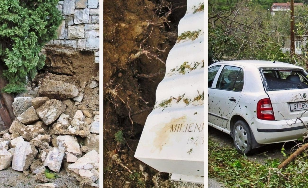 Pogledajte kako se nevrijeme manifestiralo na istoku Splita! U Žrnovnici su uništeni skoro svi čempresi na groblju, a neki su grobovi doslovno izletjeli iz zemlje. Bura i korijenje palog čempresa oštetili su i grobno mjesto legendarnog Miljenka Smoje. Stabla su padala po cestama, oštećeni su krovovi kuća, brojni automobili...