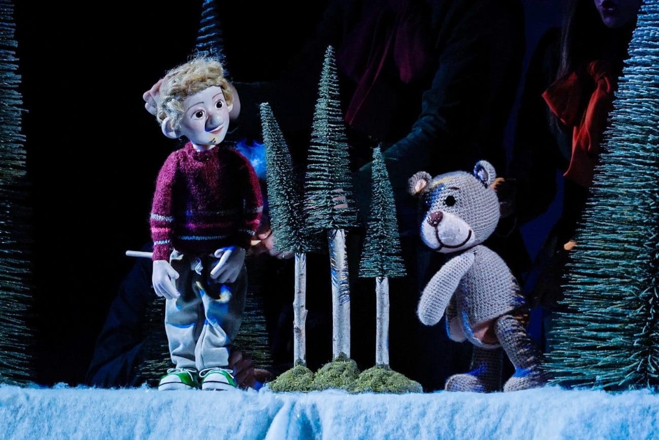 Danira Matošić scenografijom je i konceptom lutaka briljantno sup(r)otstavila svijet materijalnog i emocionalnog. Lutke iz veleprodaje načičkane su na polici Zdenkove sobe, iz njih isijava kričavost, plastika i posvemašnji nedostatak individualizma. Medvjedić je sve suprotno – vrlo tradicionalan, da ne kažemo staromodan, ručno pleten, lišen čuda tehnike na mjestu gdje treba biti srce. Upravo je ta njegova jednostavnost ključ savršenosti – netko ga je izradio da bude jedinstven, neponovljiv, poseban, a osnovna mu je funkcija ono što nam često za promaknuti dok trčimo za svjetlima veleprodaje – toplina. Zdenko isprva ne shvaća da je poklon Djeda Mraza baš ono što mu treba, čak mu se planira žaliti u dalekoj hladnoj Laponiji. Putem upoznaje Snjegovića kojem nedostaju dijelovi tijela, a Medvjedić je taj koji ne trpi ničiju nepotpunost – ako njegova topla pletena ručica (uz prekrasnu metaforu topline posredovanu dizajnom svjetla) može pomoći. Iako se i Zdenko i Medo na svoje duhovno i tjelesno putovanje Djedu Mrazu upućuju da mu se požale, na kraju im takav arbitar uopće ne treba. Time će racinalni Djedica, u kratkoj ali slatkoj izvedbi Filipa Luke Gospića, postati lik koji tek iz daljine promatra pozitivan razvoj situacije. Antoine de Saint-Exupéry izjavio je „Cilj nije mjesto kojem idemo, nego način na koji idemo.“ Taj se citat odlično uklapa u putovanje protagonista „Crne knjige Djeda Mraza“, koji su kompromisom i vlastitim rastom dali najljepšu pouku – do cilja se može doći i ako „samo“ rasteš putujući.