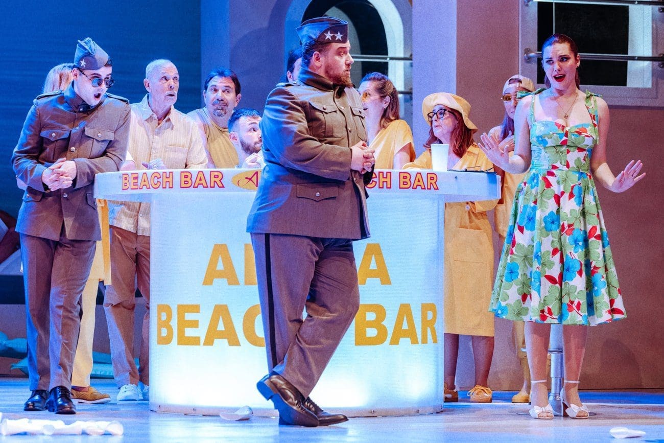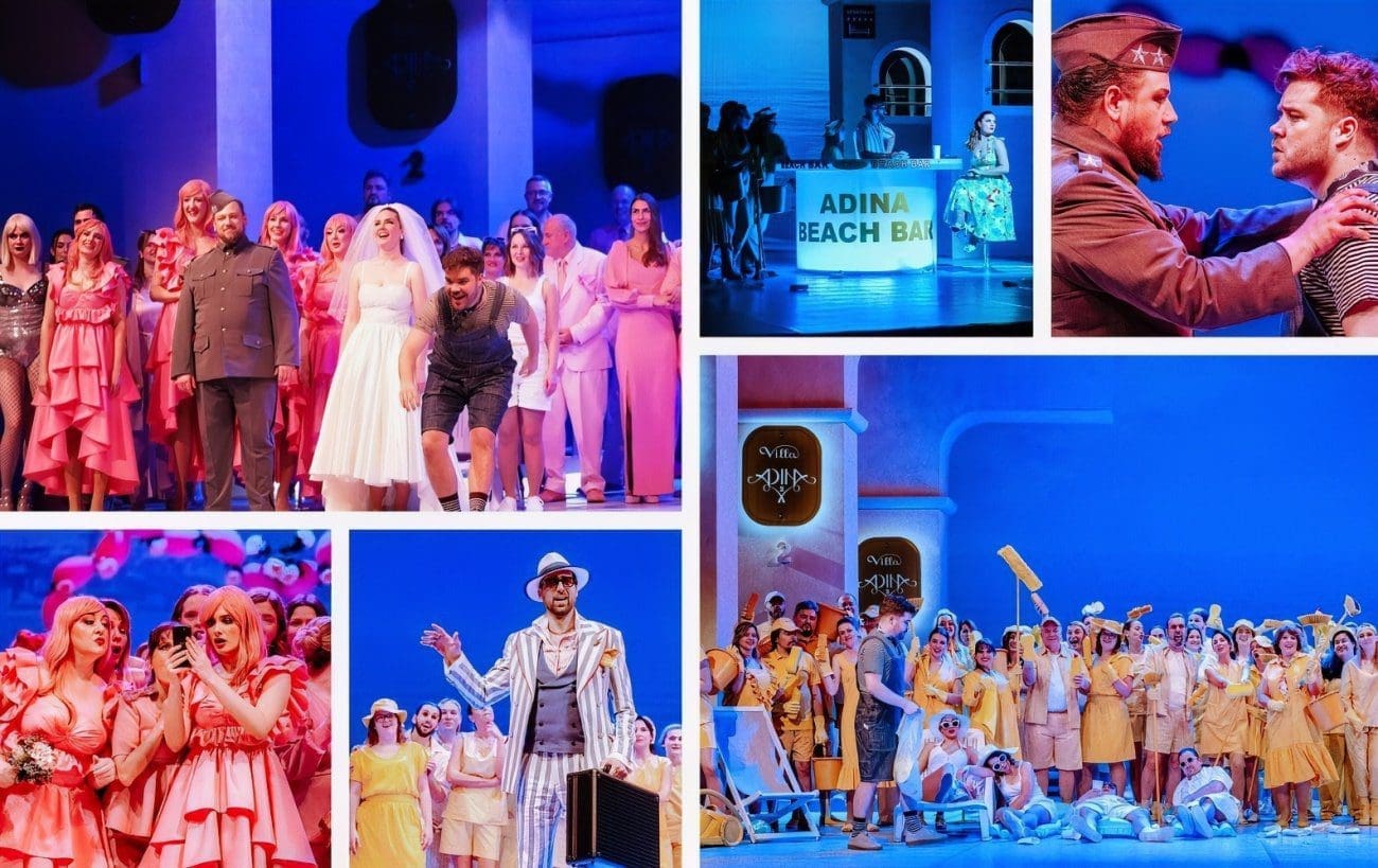 Scenografija koji potpisuje Marin Gozze prati iznimno duhovit koncept apartmanskog naselja kao mjesta radnje. S jedne su strane uglancani blokovi Ville Adina, s druge je beach bar koji nosi njezino ime, a nisu izostale ni table s klasifikacijom apartmana. Tijekom pripreme vjenčanja na pozornici je nekoliko ružičastih balonskih instalacija koje su, u kombinaciji s prelijepim voluminoznim kostimima, izuzetno fotogenične, scenične i oku ugodne. Rekviziti poput ležaljki, napuhanaca i Hajdukove lopte za plažu šlag su na torti slavlja koje se vrti između potpuno „olešenih“ turista bez mjere i lokalaca koji kao da žive samo za to s kim će se spetljati prelijepa Adina. Scenski pokret Leva Šapošnikova ovom je sjajnom kreativnom timu dao toliko ritma i komike da se čini da bi Donizetti, ovako urešen i detaljan, funkcionirao sve i da je nijemi film, a ne komična opera.