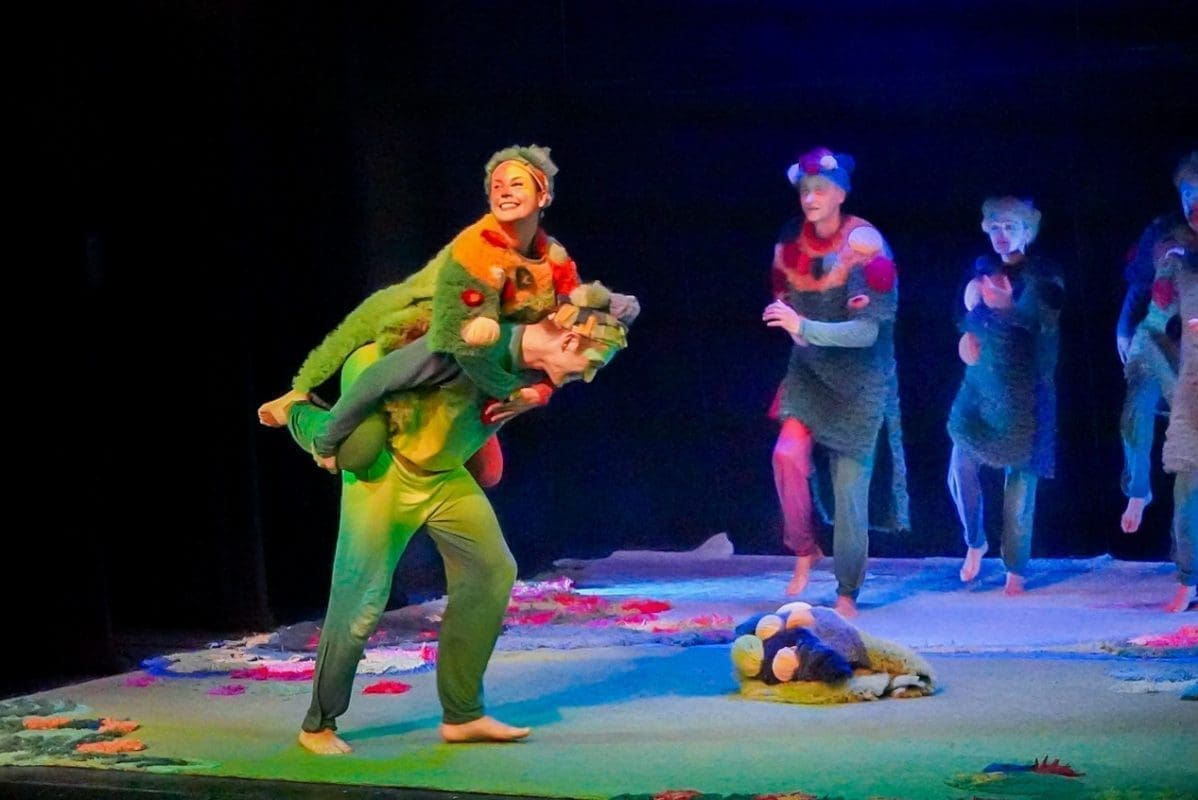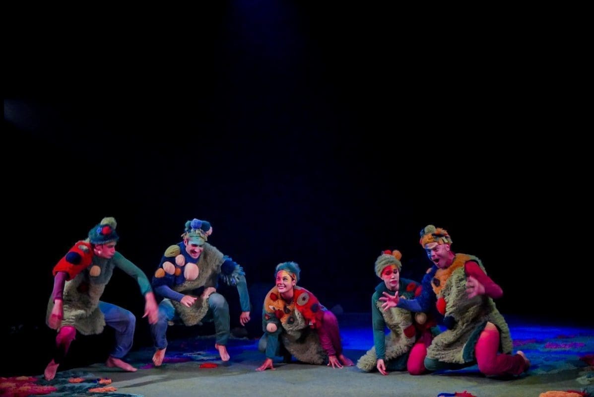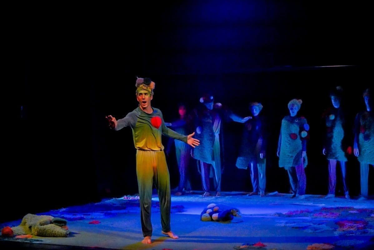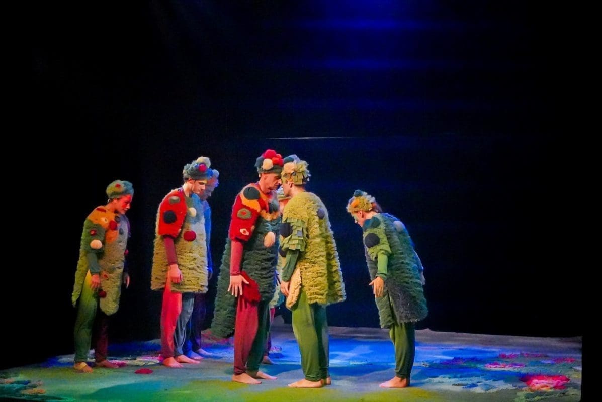 Šumovi močvare, poluartikulirano siktanje, gibanje na granici između životinje i čovjeka, lelujajuća tijela koja su više tjelesa, dramatično prigušeno svjetlo, dovoljno tek da osvijestimo tamu, prelijepi, kompleksni kostimi Sonje Obradović koji isprva djeluju kao oklop od mahovine i saprotrofa u koji su obrasla ta svojom krivnjom ukalupljena tijela – sve je to vidljivo već u prvim sekundama izvedbe „Dankova srca“. Predstava je to koja od početka hrabro korača u rizik – rizik pripovijedanja pokretom. Teško se sjetiti predstave koja je toliko pozornosti dala mogućnostima ljudskog (ili humanoidnog?) tijela. Pleme koje uspavljuje Danka žustrinom svoga njihanja sugerira emocionalno stanje, njihovo spavanje (i zbiljsko i metaforičko) koje se odvija u potpunoj sjeni situacija iz prvog plana savršeno je zibanje pasivnih promatrača koji se boje postati aktivni sudionici. Simpatični vizualni gegovi, posebno kod Stipe Jelaske i Stipe Gugića, izazivaju niz komičnih reakcija kod publike, a osobito važni dijelovi radnje poput prijelaza iz svijeta tame u svijet svjetla, pravi organski leap of faith, karakterno ocrtavaju likove – od akrobatskih skokova onih prijatelja s djetinjim povjerenjem do nešto suzdržanijeg prijelaza Vrača, plemenskog mudraca. Kad se sve zbroji – scenski je pokret u ovoj predstavi najbliže savršenom što smo gledali.