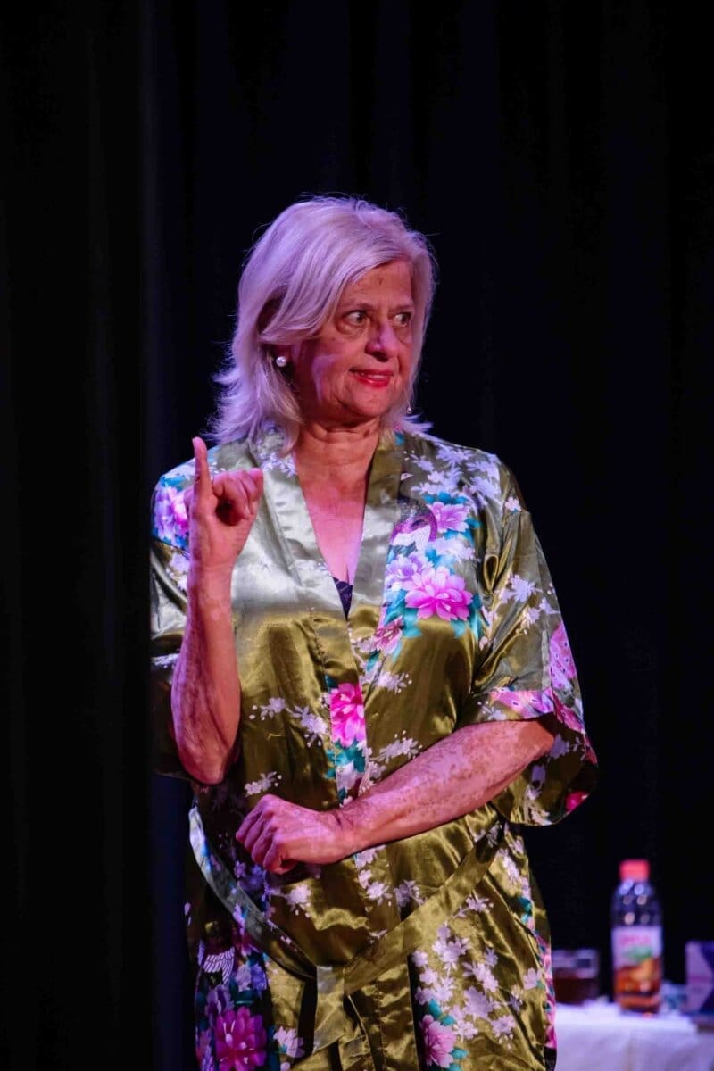 Sredovječna žena koja naizgled ne odskače od stereotipa – lista kataloge s prehrambenim proizvodima, preračunava eure u kune, pokušava uštedjeti. Samokritična je – na njezinu tijelu koje sjajno nosi godine vidljive su promjene, no ona je svjesna da živi u svijetu koji ti ne dopušta da dostojanstveno stariš. Kad je ponese želja za hranom i muž pomalo zajedljivo primijeti da „opet muma“, shvati da joj se čini da se deblja čim malo dublje udahne. Ali njezina sprava spasa nisu ni prostirka ni utezi – nego bistar um i humor. Neće ostati dužna ni suprugu, kojega simpatično opisuje kao čovjeka-tuljana, ni svim onim replikama nekadašnjih žena, lutkama s puderima „u sva tri agregatna stanja“, genetski udaljenim blizankama koje u svojim bolesnim nastojanjima za „savršenom ljepotom“ i vječnom mladošću sliče kao jaje jajetu. Spisateljica Nataša Jukić svojim tekstom, koji je na pozornici Kulturnog centra Kaštel Lukšić oživjela Lily Olga Vladić iz Amaterskog kazališta Moreta, kao da upozorava – ako izbrišemo svaku mrljicu, boru, brazgotinu i kilogram, izbrisat ćemo identitet. Nestat će posebnosti, nitko neće smjeti biti svoj. A čiji ćeš biti ako ne svoj?