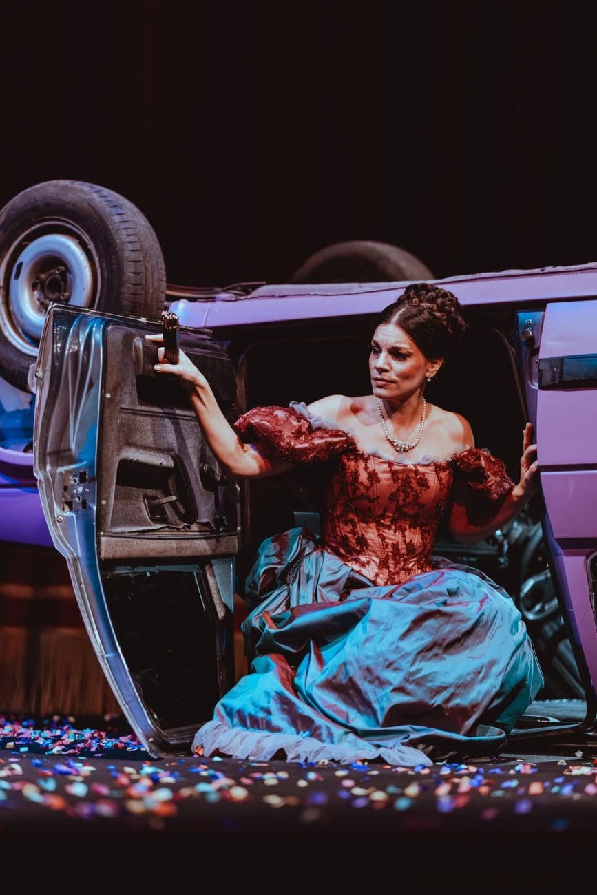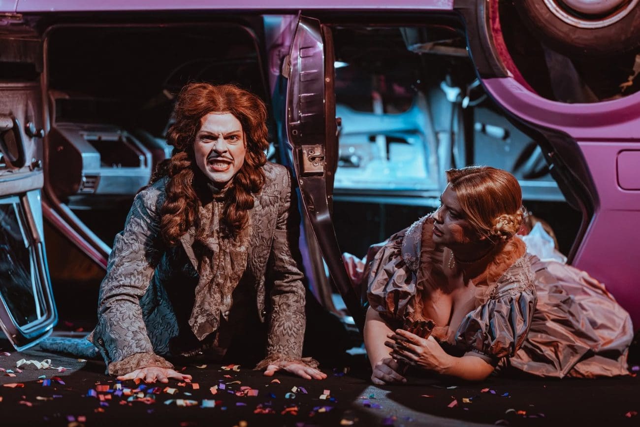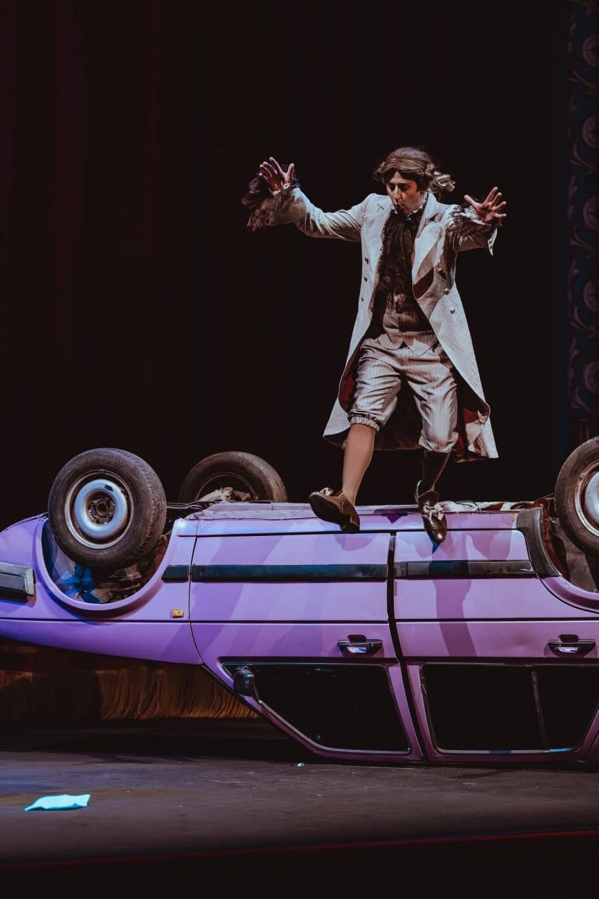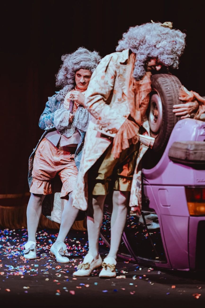 Molièreovo je 17. stoljeće period binarnih opreka. S jedne strane cvatu otkrića iz područja prirodnih znanosti, s druge se strane na smrt osuđuju fizičari i astronomi. Dok njegovi suvremenici potpuno zaljubljeni u klasičnu književnost pišu na tragu antike i renesanse, Molière kao naturalist prije naturalizma bespoštedno secira ljudske slabosti. I radi to, za današnje pojmove, u vrlo staromodnoj formi. S tom se čudnom diskrepancijom moderne teme i tradicionalna stila prekrasno nosi redatelj Miloš Lolić, koji Moliereov svijet stavlja u kakav međuprostor koji koketira s klasicizmom i prosvjetiteljstvom, ali i kuca na vrata suvremena svijeta, kao što njegovi likovi na scenu ulaze kroz prevrnuti ružičasti automobil, centralni dio vrlo skromne i funkcionalne scenografije. Ta „lijepa karampana“ moćan je subverzivni element – i svijet u kojemu njegov „Mizantrop“ živi naizgled je šaren, prpošan i zasut konfetima, ali ujedno je i izokrenutih društvenih vrijednosti. Društveno je prihvaćeniji onaj koji finije govori, uljudnije laska i uspješnije laže.