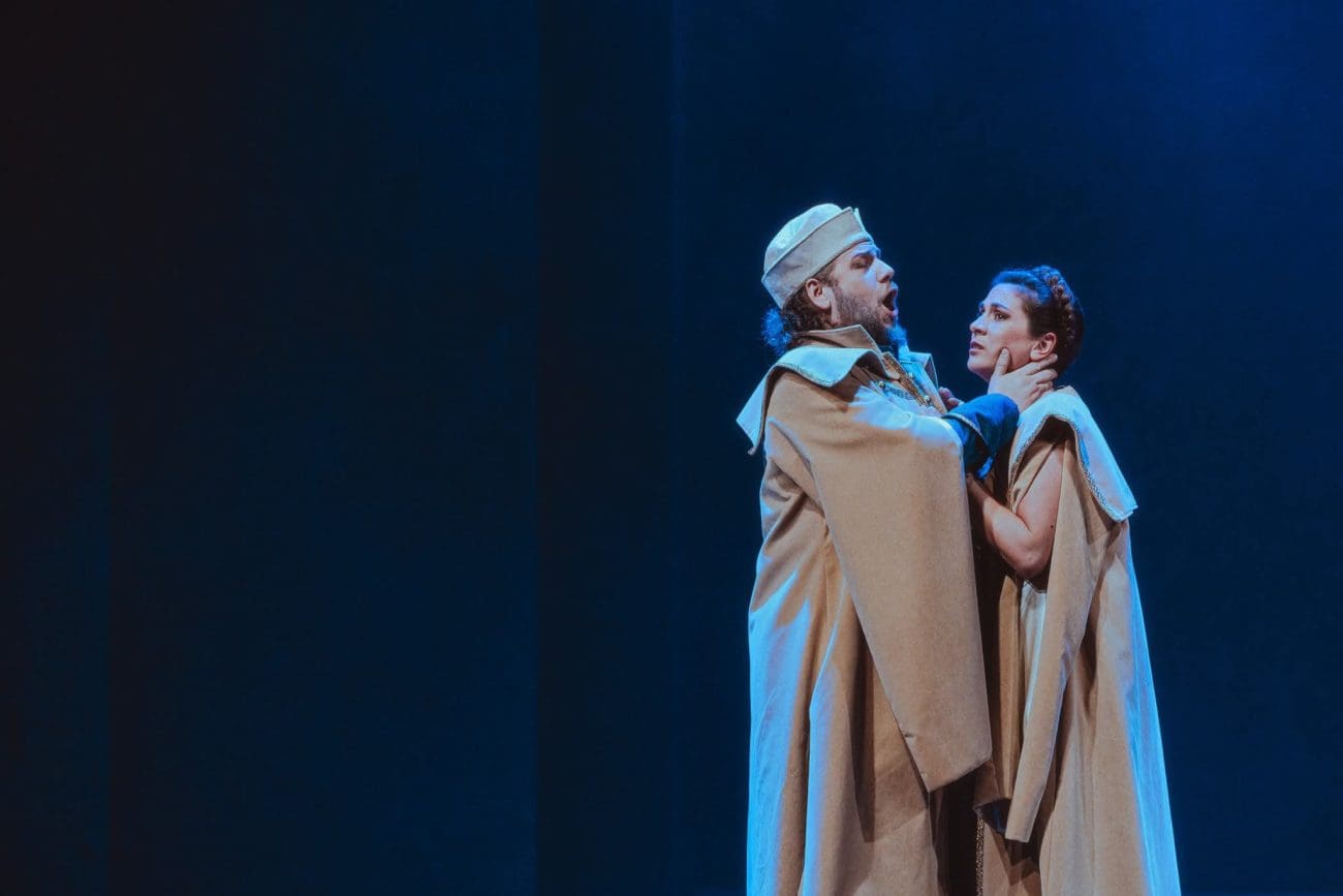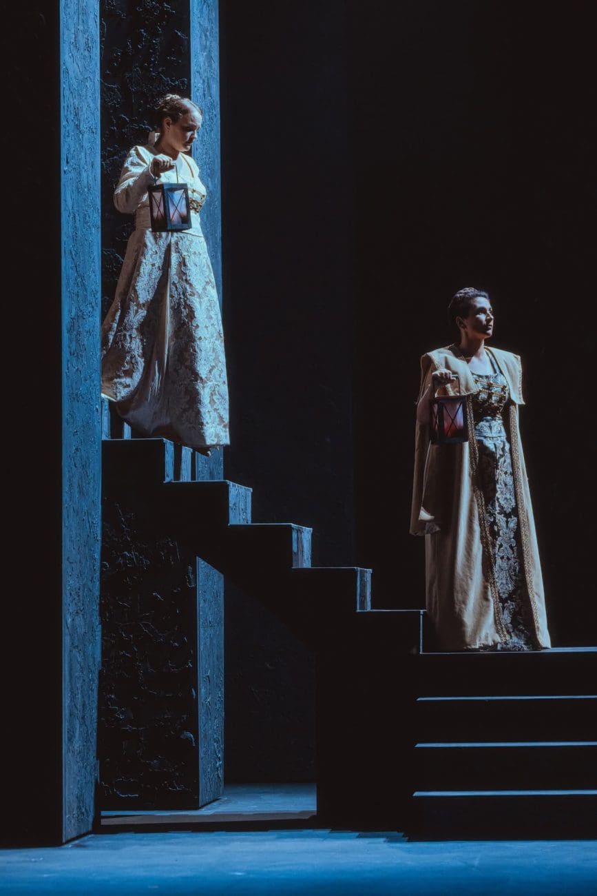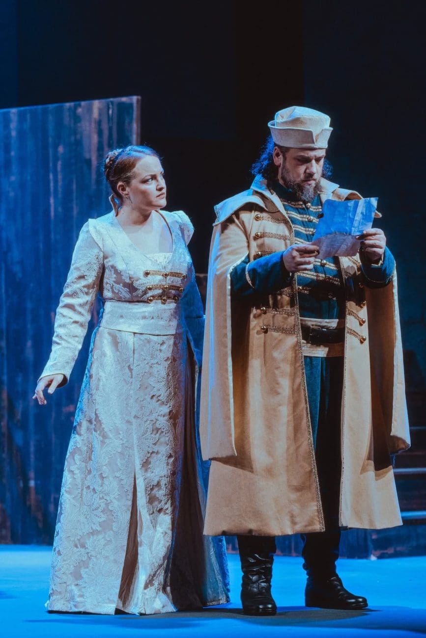 Osim diskretne i funkcionalne scenografije Ive Knezovića, prelijepa je i kostimografija Tee Bašić Erceg, u kojoj se spajaju tradicionalno i moderno. Turska je vojska ostala u povijesnim tonovima, s upečatljivim oglavljima i turbanima, hrvatska je u kraljevski plavoj boji, a obitelj Zrinjski iz tamnih je nijansi prebačena u neviniju i upečatljiviju bež – s bogato ukrašenim materijalima i snažno strukturiranim ramenima kao zaštitnim znakom kostima. Jako nas se dojmio dizajn svjetla Vesne Kolarec kao živi dio scenografije, posebno u povremenim bljeskovima mračnog i zagušenog podruma gdje je Eva pokušala sakriti svoju kćer Jelenu. Pohvale zaslužuje i Maja Huber, i za plesnu koreografiju u turskim odajama, i za čitav scenski pokret u kojemu je zbor postao živa slika zajedništva i otpora.