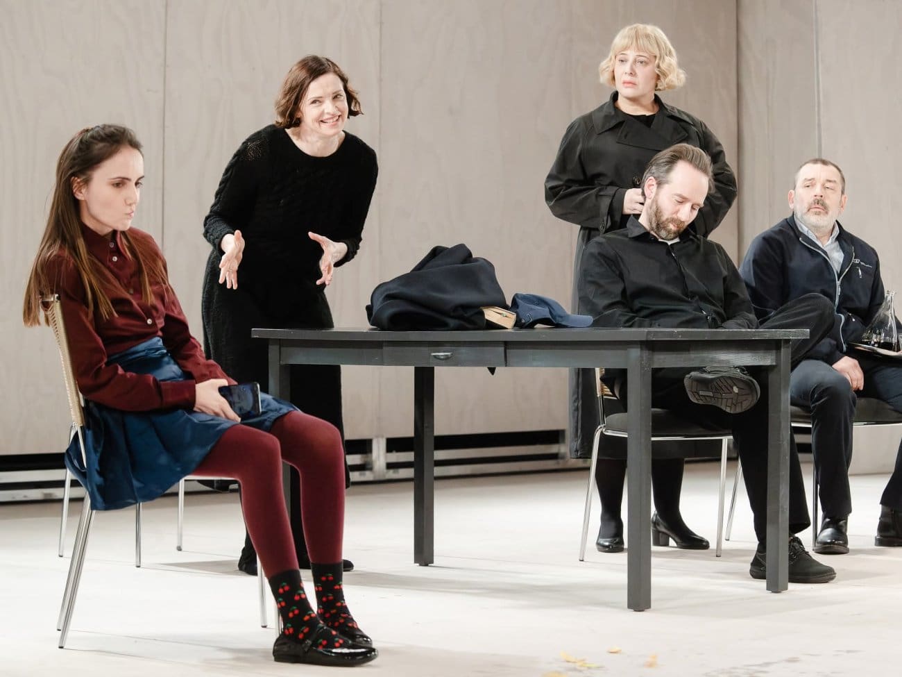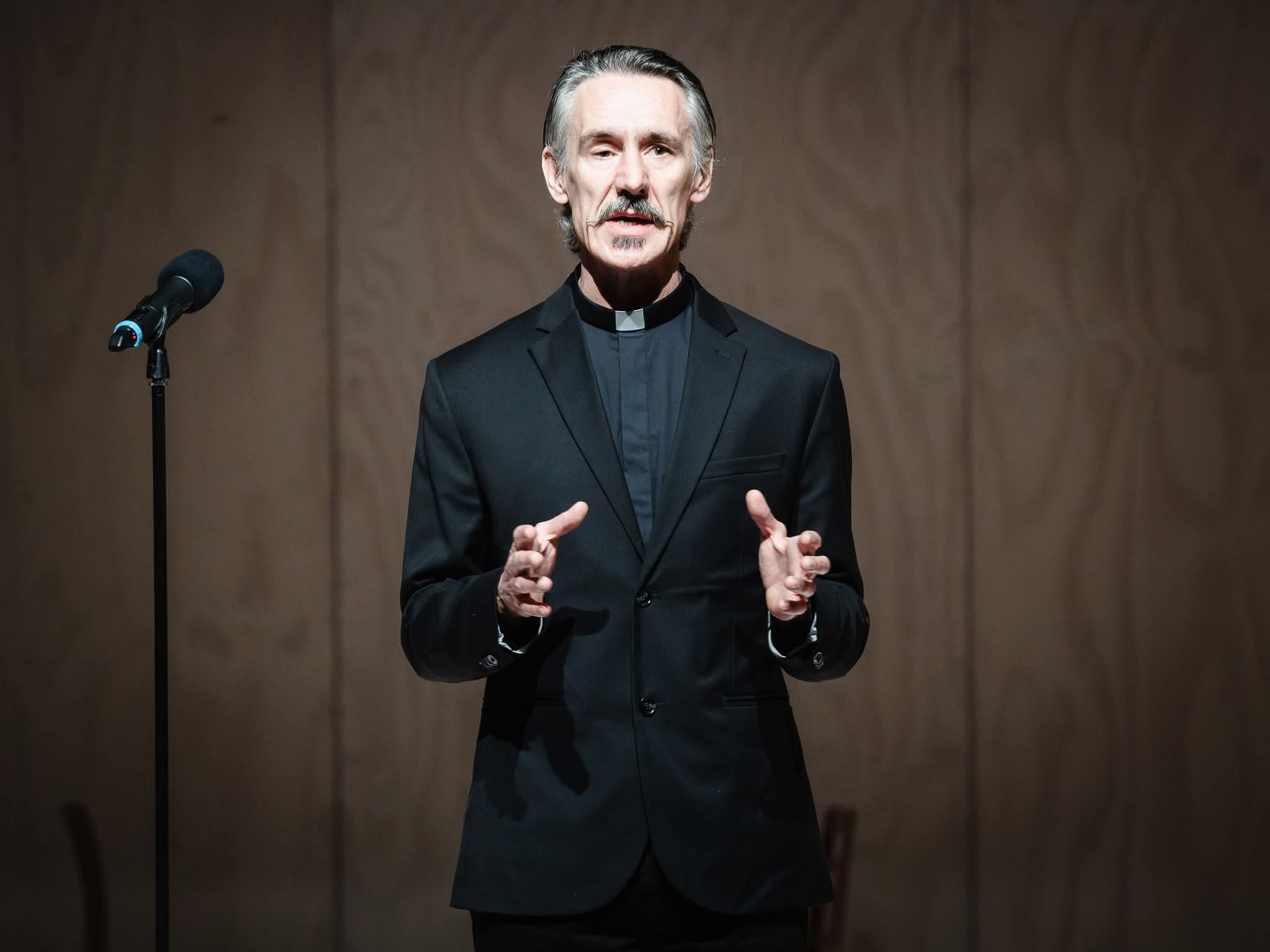 Mate Matišić u prvome je tekstu (ne)poznati netko, dramski pisac s autonomijom, jedini koji se ne boji, „cenzure katoličke trupe“. Dražen Čuček nastupa kao Svećenik i „kor od jedne osobe“ razmjerno rijetko komentirajući zbivanja među likovima, tek primjećujući, u trenucima obiteljske paranoje, da u kućnim ikonama i raspelima nema uređaja za snimanje ni prisluškivanje. Koliko je taj lik važan za radnju, a koliko ubačen da bi uzburkao duhove publike u kojoj se autori kronično boje povampirenih vjernika 20-ak godina nakon što je to prestalo biti zanimljivo, neka svaki gledatelj procijeni zavirivši u svoje interpretativne erose.