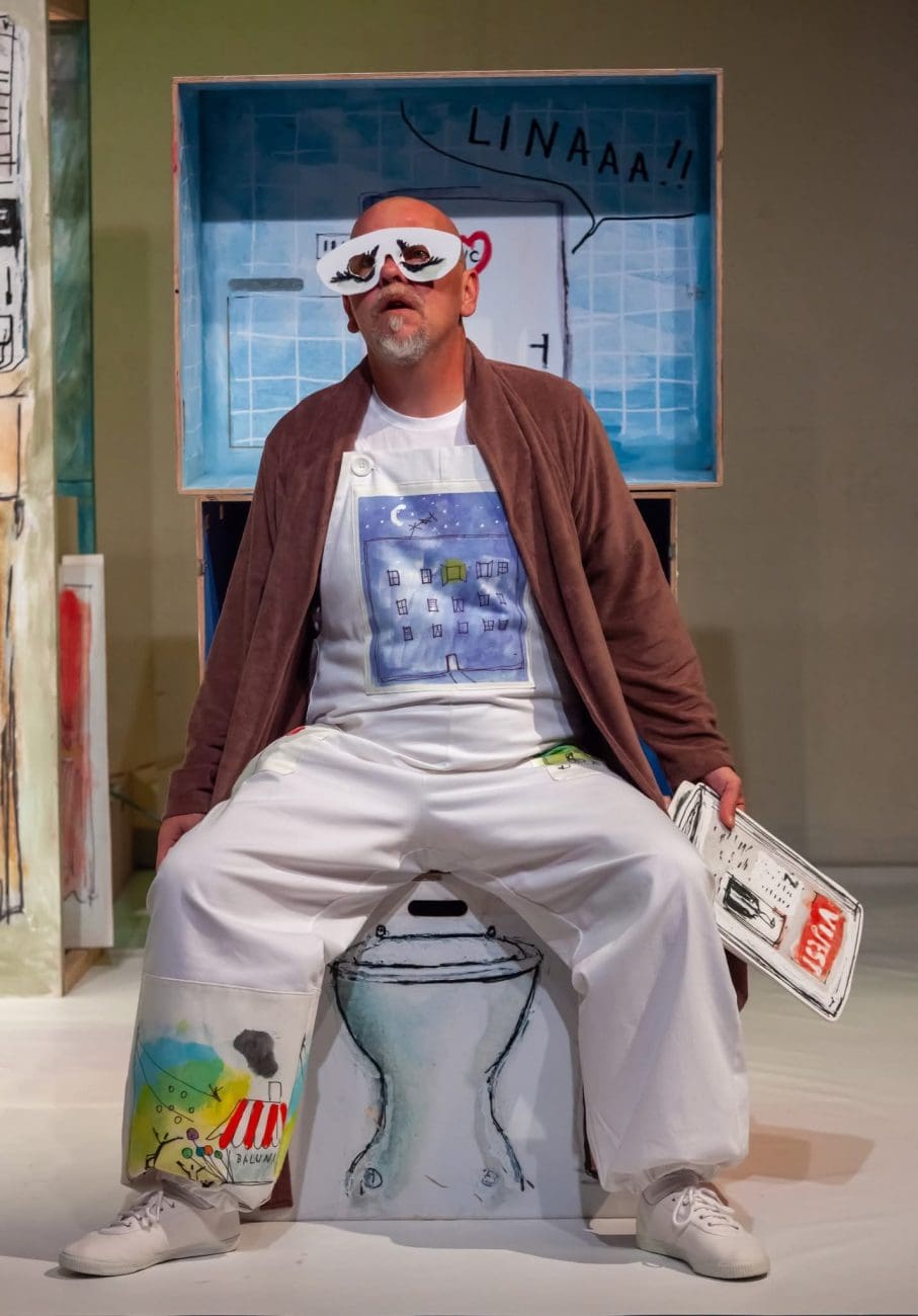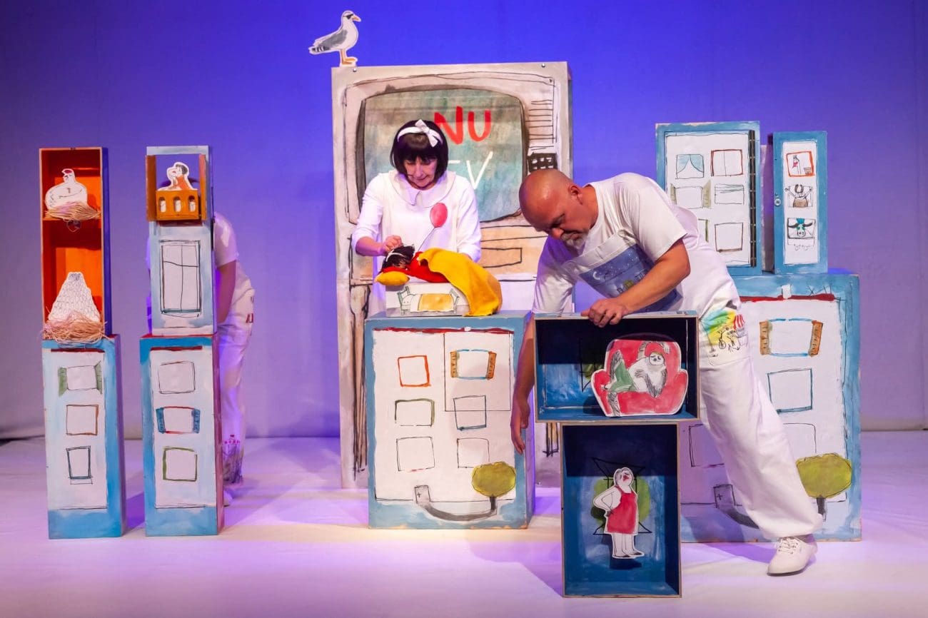 Šarma ne nedostaje ni u prikazu stanara Nastjine zgrade, koja je likovno oblikovana u prepoznatljivu stilu Tisje Kljaković Braić. Električna jegulja iza sebe ima odličan svjetlosni efekt, groteskno natapirana gospođa Tapir jedva može proviriti kroz prozor od svoje ekstravagantne frizure, a vrijedna koka Anđelka prevažna je u svom revnom ležanju jer – bez jaja nema ni sladoleda! Zasigurno će jedan od omiljenih likova biti ljenjivac Božo Linčina, čije vječno „Evo sad ću!“ funkcionira kao kolektivna zaraza virusom lijenosti, mantra, opravdanje, ali i provokacija za suprugu kojoj je dosta biti vječna pokretačica svega. Ti „ženski“ dijelovi predstave (odlazak na tračersku kavu s prijateljicom, žaljenje na muža, nesporazum s frizerkom, svađa u kazalištu) daju dodatnu dozu simpatičnosti likovima kakve ima svaka zgrada – samo što su im lica nešto ljudskija. Iako Nastji u takvu svijetu više nije dosadno, kad se pojavi obitelj Čagalj (s referencom na popularnog splitskog pjevača!), Nastja će se opet sjetiti svoje sasvim logične djetinje želje – društva svojih vršnjaka.