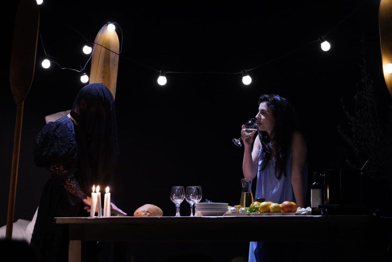 Stabilan stol, mirisne dubrovačke naranče, vesla, svjetla, bačva/bure, maslina – scenografija pročišćena nepotrebnog i u službi funkcionalnog na prvi pogled nije otkrivala kakve dubine i težine stoje iza dramaturgije „Smrti u Dubrovniku“. Tekst se isprva fantastično referira na tragičnu smrt prve civilne žrtve u napadu na Grad, književnika, novinara i dramaturga Milana Milišića. Pozivajući se na naslov zbirke „Volile su me dvije sestre skupa“, ansambl nas doslovnošću kolektivne ljubavi odmah tjera na skidanje maski tašte malograđanštine i purističkog intelektualizma. Kad se rastoče mnoge neiskrene leteće floskule odgovora na pitanje „Zašto volim domovinu?“, publiku zabljesnu i dva gluteusa, onako kako je grupa „Nipplepeople“ sad već davne 2015. zabljesnula javnost subverzivnim stihovima pjesme „Frka“.