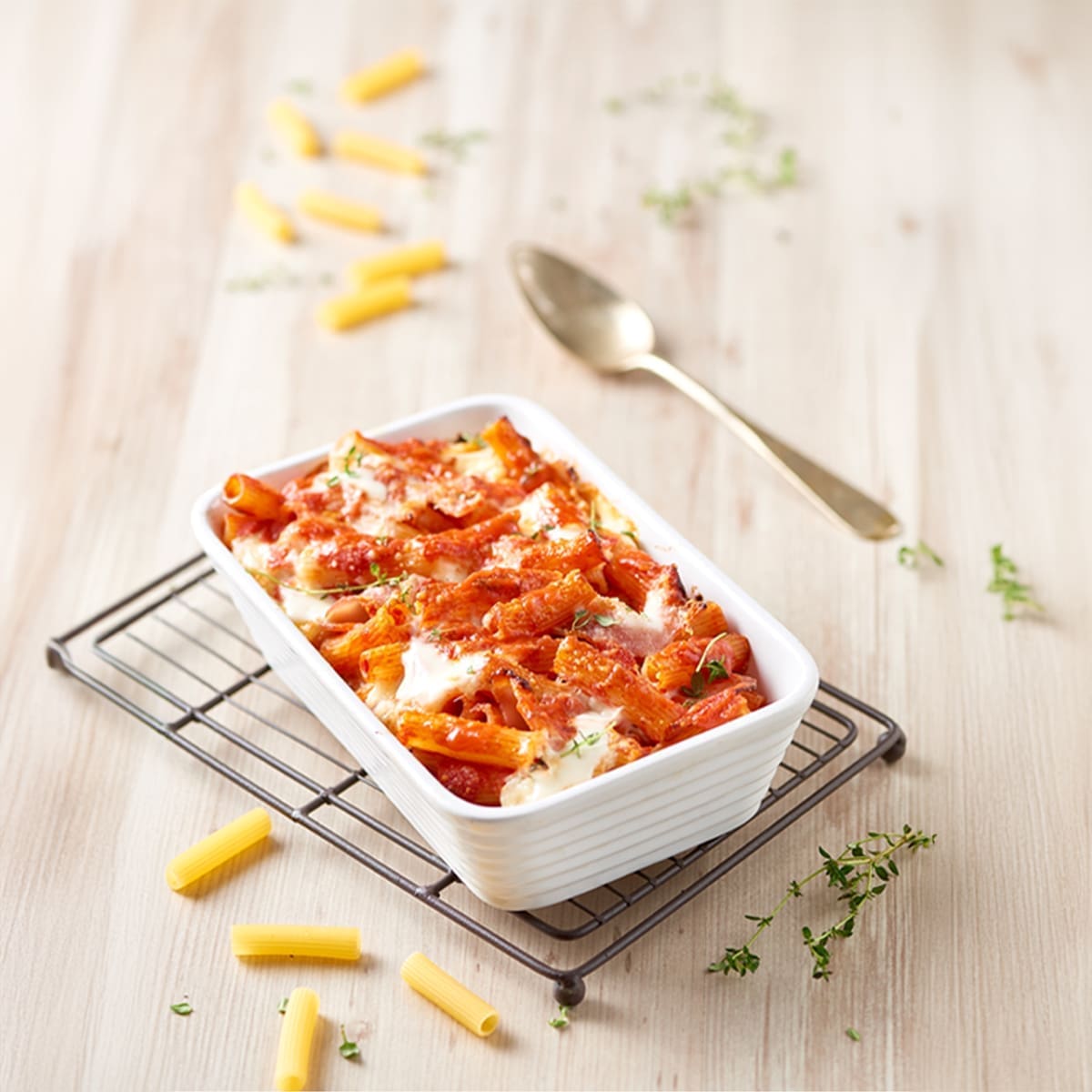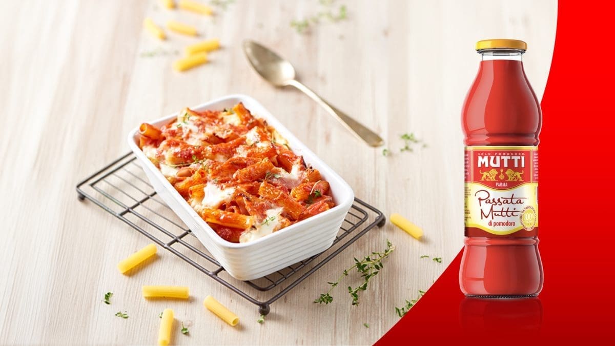 Sitno nasjeckajte ljutiku i lagano je popržite na 2 žlice ulja, dodajte pasiranu rajčicu i kuhajte 5 minuta. Skuhajte tjesteninu pazeći da ostane vrlo “al dente”, ocijedite je i dodajte u rajčicu. Mozzarellu nasjeckajte na kockice a pršut narežite na kriške. Dno posude za pečenje prekrijte s polovicom umaka bešamel, zatim stavite tjesteninu, po njoj rasporedite mozzarellu i kriške pršuta. Završite s nekoliko preostalih žlica umaka bešamel i pospite parmezanom. Pecite u pećnici na 180°C 20 do 25 minuta. Pospite listićima svježeg origana.