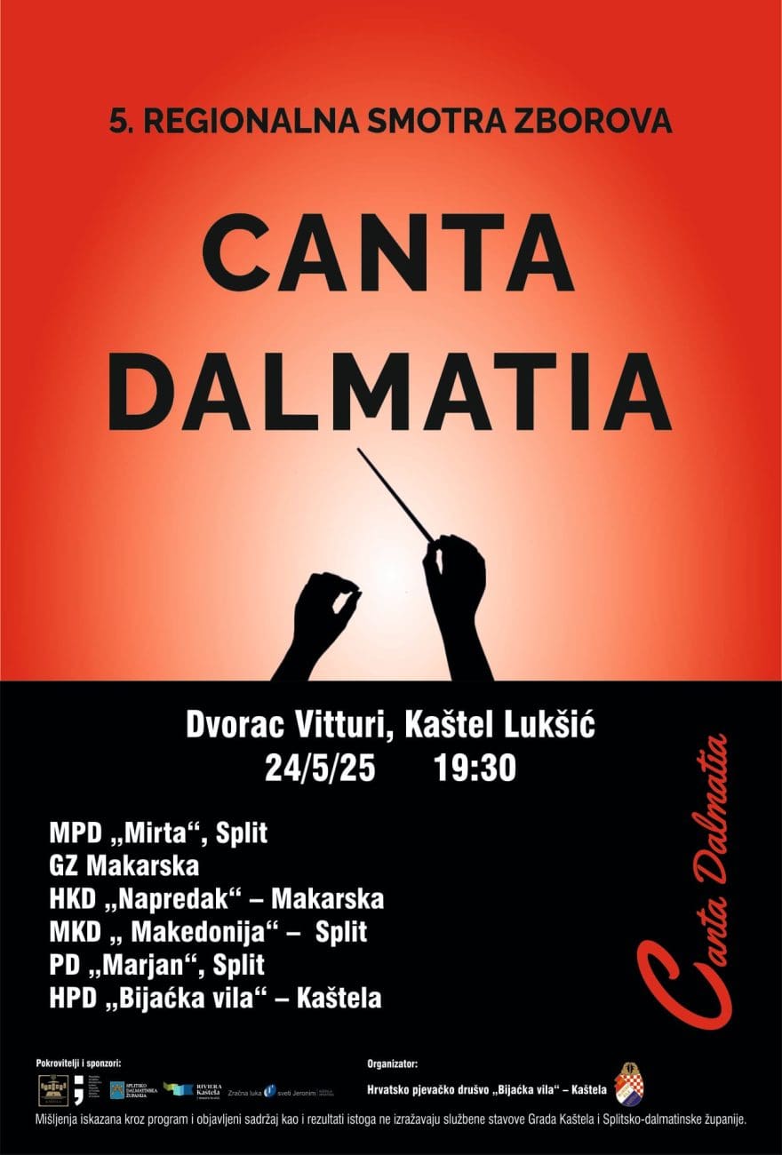 Regionalna smotra zborova i malih vokalnih sastava Canta Dalmatia održat će se 24. svibnja 2025. u 19:30 u Dvorcu Vitturi u Kaštel Lukšiću. Nastupiti će HPD “Bijaćka vila”, Hrvatsko kulturno društvo „Napredak“ – Makarska, Mješovito pjevačko društvo “mirta”, Gradski zbor Makarska, Makedonsko kulturno društvo „Makedonija“ – Split, Pjevačko društvo “Marjan”