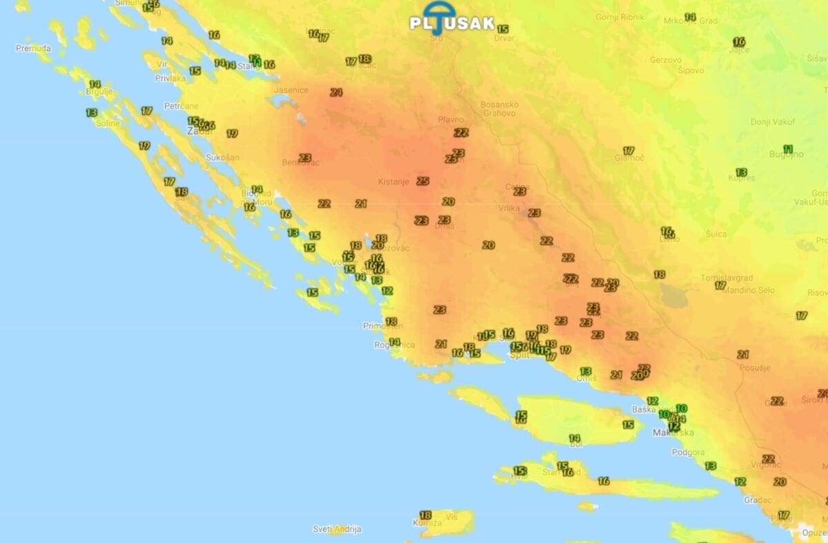 Po visini se nalazi vrlo topla zračna masa, a o tome svjedoči podatak o današnjim temperaturama zraka. Primjerice, na najvišem vrhu Biokova, Svetome Juri, minimalna jutarnja temperatura nije padala ispod 6°C, a u ranim popodnevnim satima dosegla je dvoznamenkaste vrijednosti.