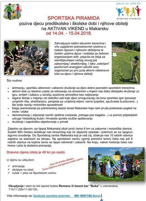 U subotu, 14. travnja, u 12 sati na Sportskom centru Makarska okuplja se preko 700 sudionika sportsko rekreativna manifestacije ''Igrom kroz sport i rekreaciju do zdravih navika''. Sudjeluje preko 400 sudionika iz grada Zagreba te 300 sudionika s područja Makarske Rivijere.