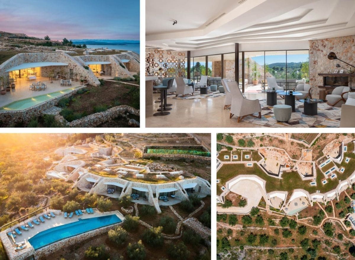 Veliki infinity bazen s morskom vodom i potpuno otvorenim pogledom na pučinu i otočiće nalazi se par koraka od velikih terasa soba. Iz svake sobe uska kamena staza vodi izravno na bazen, između stabala maslina i mirisnog grmlja lavande i smilja. Manji bazen sa slanom vodom nalazi se i u malom ali luksuznom spa prostoru skrivenom uz stijenu, u kojem se tretmani baziraju na ljekovitim svojstvima maslina.