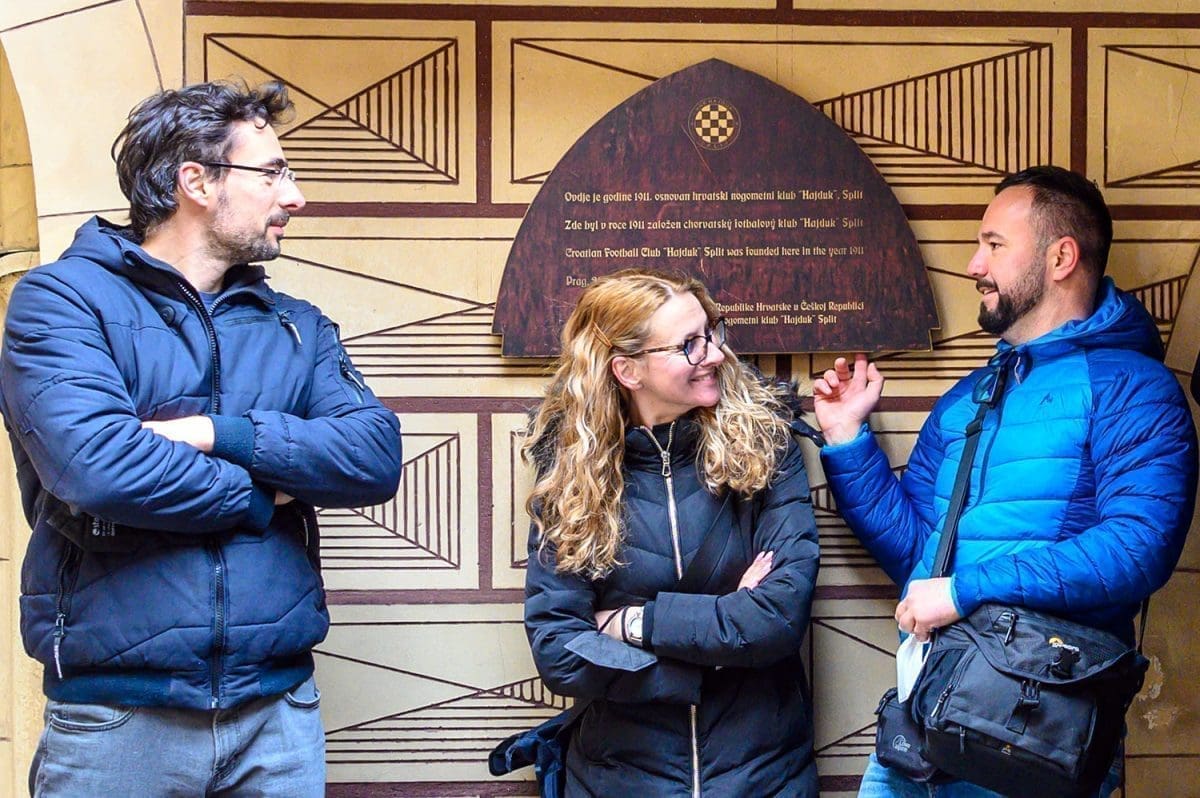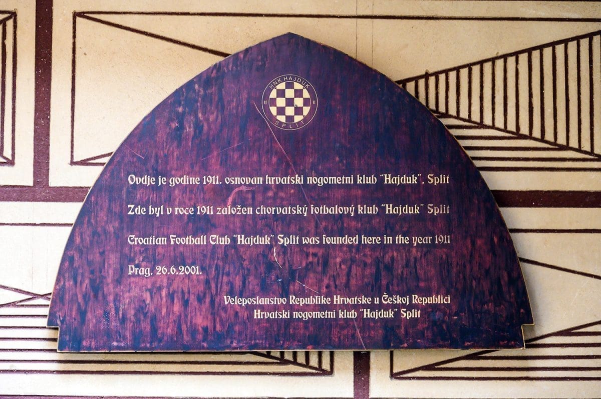 "Ovdje je 1911. osnovan hrvatski nogometni klub "Hajduk" Split. Prag, 26.6.2001. Veleposlanstvo Republike Hrvatske u Češkoj Republici, Hrvatski nogometni klub "Hajduk" Split", stoji na ploči u dvorištu legendarne pivnice i restorana "U Fleků" u Pragu, u Češkoj.