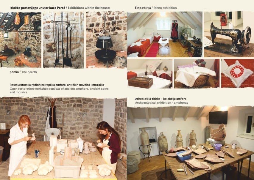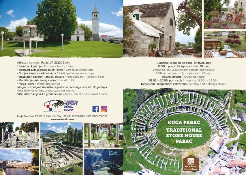 Naime, tradicijska kuća Parać smještena je na amfiteatru arheološkog lokaliteta Salona a sagrađena je 1863. od kamena salonitanskog amfiteatra, u kojoj se isprepleće priča o antici i o starohrvatskom Solinu. Na katu kuće smještena je kolekcija amfora te etno zbirka realizirana u suradnji s udrugom Solinjani gdje se može vidjeti kako je izgledao namještaj i predmeti spavaće sobe iz pučke baštine grada Solina. U prizemlju kuće već tradicionalno smještena je radionica antičkih novčića, mozaika, amfora i sličnih artefakata koju realiziramo u suradnji s Javnom ustanovom u kulture Zvonimir, dok se uz radionicu u prizemlju nalazi i komin. Riječ je o aneksu kuće koji je grad Solina uredio, a koji je TZ grada Solina opremila s prigodnim sadržajima pa naši posjetitelji mogu vidjeti siniju, bukaru, demejanu, tronošce itd. Osim toga svi posjetitelji imaju na raspolaganju sanitarni čvor i vodu te budu posluženi s kavom, kroštulama, bajamima i suhim smokvama.