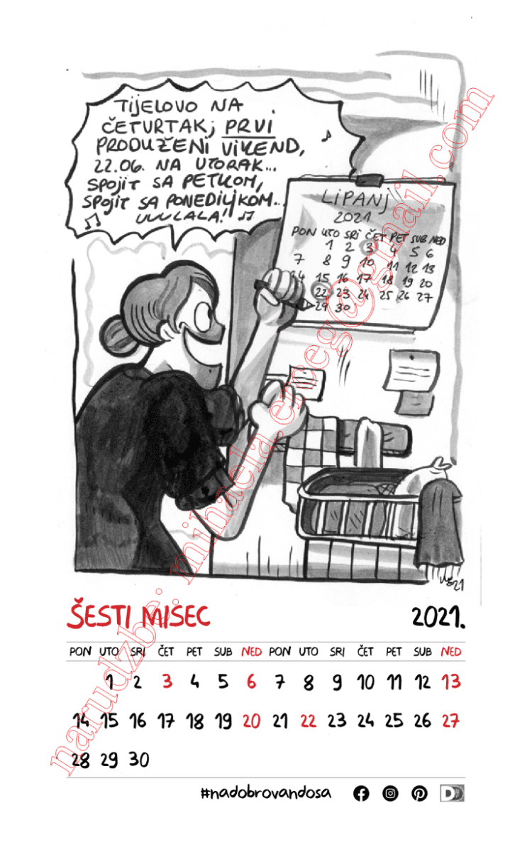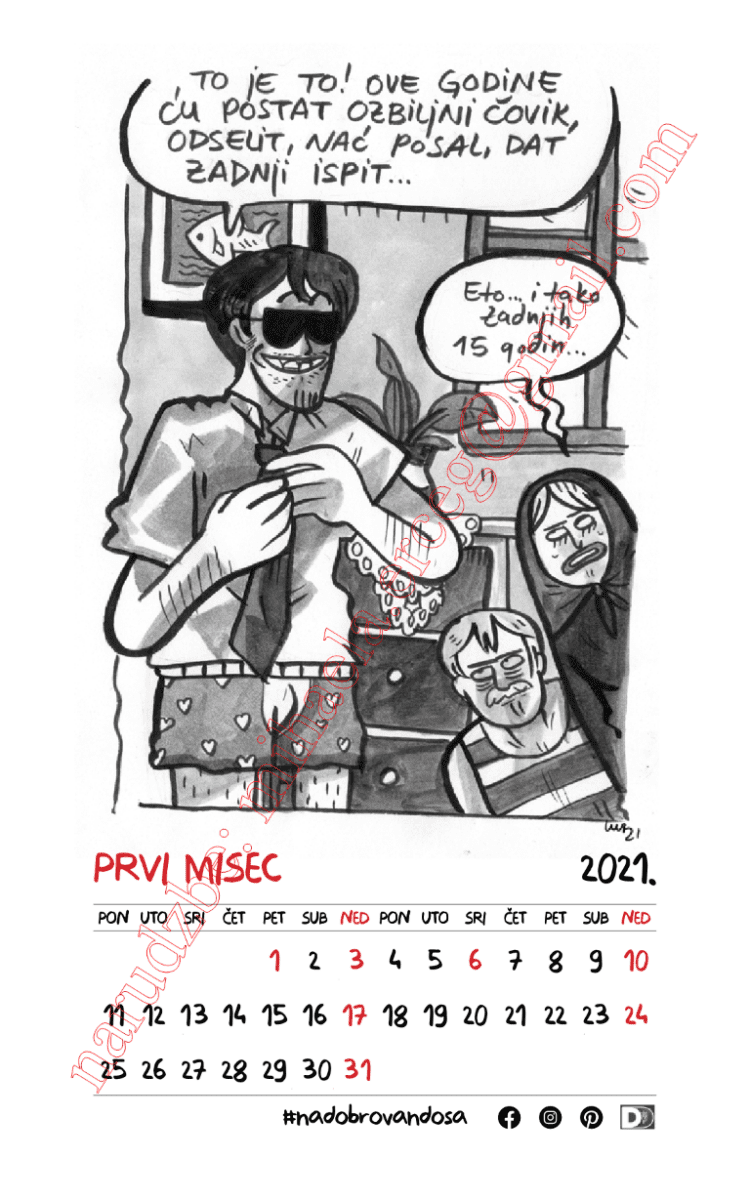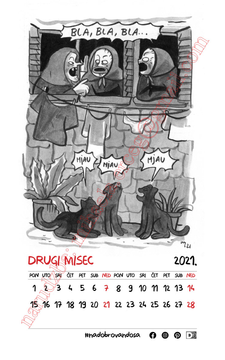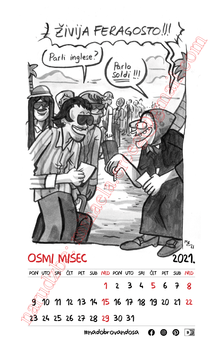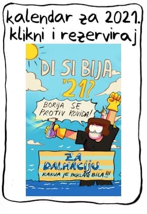 Kalendar pod nazivom „Di si bija ’21.“ jedan je od rijetkih kalendara koji za motive nudi ilustracije dalmatinskog humora, umjesto već viđenih fotografija panorama praznih mjesta i mora, a dvanaest duhovitih obrada svakog mjeseca, uz nazive kakvima ih u žargonu nazivamo „prvi, drugi, treći, … misec“ mogli bi doista predstavljati najoriginalniji dalmatinsko-božićni poklon-suvenir ove godine.